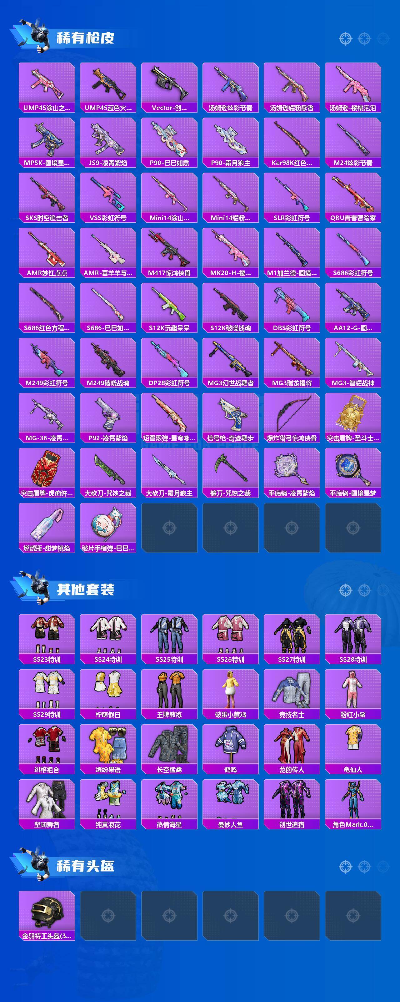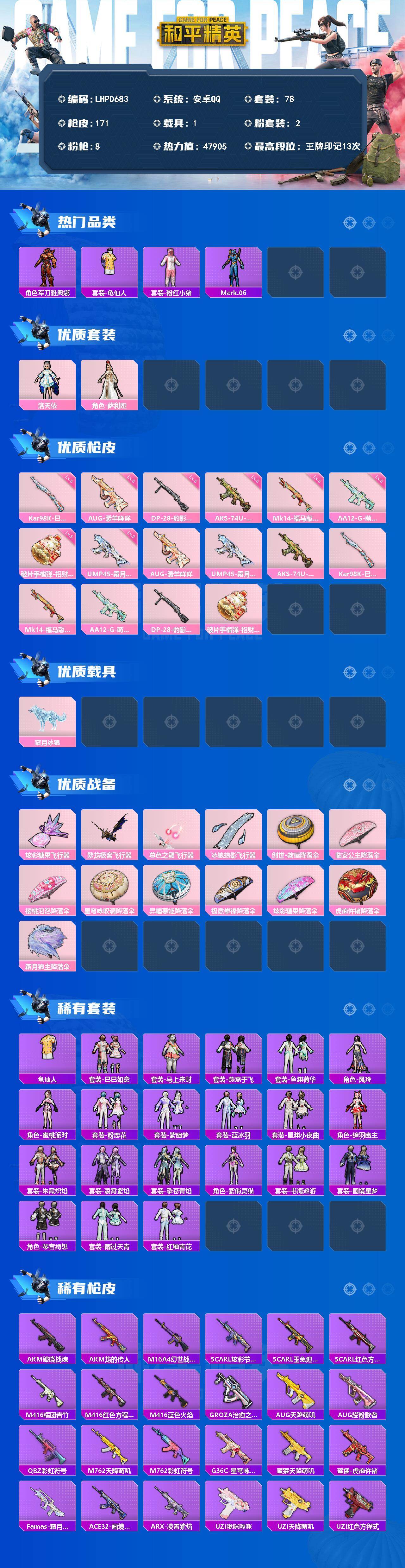 - [16333245]【特价出售/店主推荐】安卓 手Q-2粉装-5特效枪-1载具-1粉色飞行器-51800热力值-11王牌印记-125套装-163枪皮 【热门品类】:套装-浪漫天命,角色-军刀雅典娜,套装-暗夜行者,套装-龟仙人,套装-暗影哥特 【粉色套装】:粉装-未来歌姬,粉装-闲梦青缨 【粉色枪皮等级】:AKM-绿萝繁花(五级),M416-至情至圣(九级),Vector-环太平洋(七级),AKS-74U-森灵之息(五级),Kar98K-巳巳如意(五级) 【粉色载具】:合金龙骨(绿) 【粉色枪皮】:AKM-绿萝繁花,M416-至情至圣,Vector-环太平洋,AKS-74U-森灵之息,Kar98K-巳巳如意 【粉色飞行器】:极意拳锋飞行器 【粉色降落伞】:未来战士降落伞,环太平洋降落伞,彩虹甜喵降落伞,旋转彩虹降落伞,第五大道降落伞,闲梦青缨降落伞,圣堂之誓降落伞,千金淑猫降落伞,星穹咏叹调降落伞,炫彩糖果降落伞 【稀有套装】:套装-龟仙人,套装-巳巳如意,套装-雪国风尚,套装-糖糖葫芦,套装-青团波波,角色-摩登魅猫,套装-鱼渊荷华,套装-星渊小夜曲 【稀有枪皮】:AKM-影袭,AKM-环太平洋,AKM-霓虹街区,AKM-龙的传人,M16A4-幻世战舞者,M16A4-甜心亚梦,SCAR-L-夜灯,SCAR-L-未来战士,SCAR-L-炫彩节奏,SCAR-L-玉兔迎春,M416-糯团青竹,M416-诡夜天鹅,GROZA-彩虹符号,GROZA-影袭,GROZA-懵萌河马,GROZA-田园牧歌,AUG-天降萌叽,AUG-闲梦青缨,QBZ-未来歌姬,QBZ-银碳小老虎,M762-动感兔斯基,M762-天降萌叽,M762-第五大道,Mk47-妙红点点,G36C-六号树人,G36C-懵萌河马,AC-VAL-天降萌叽,AC-VAL-快闪甜心,AC-VAL-甜心亚梦,蜜獾-天降萌叽,蜜獾-娇憨猪猪,UZI-啾咪啾咪,UZI-天降萌叽,UZI-娇憨猪猪,UZI-影袭,UZI-金风玉露,UMP45-涂山之恋,UMP45-炫光之旅,Vector-生命誓言,Vector-田园牧歌,汤姆逊-天降萌叽,汤姆逊-环太平洋,P90-倾城蜜语,P90-快闪甜心,P90-飞驰魅影,P90-巳巳如意,Kar98K-2B战斗服款,Kar98K-影袭,Kar98K-星穹咏叹调,M24-影袭,M24-奇异狩猎者,AWM-圣堂