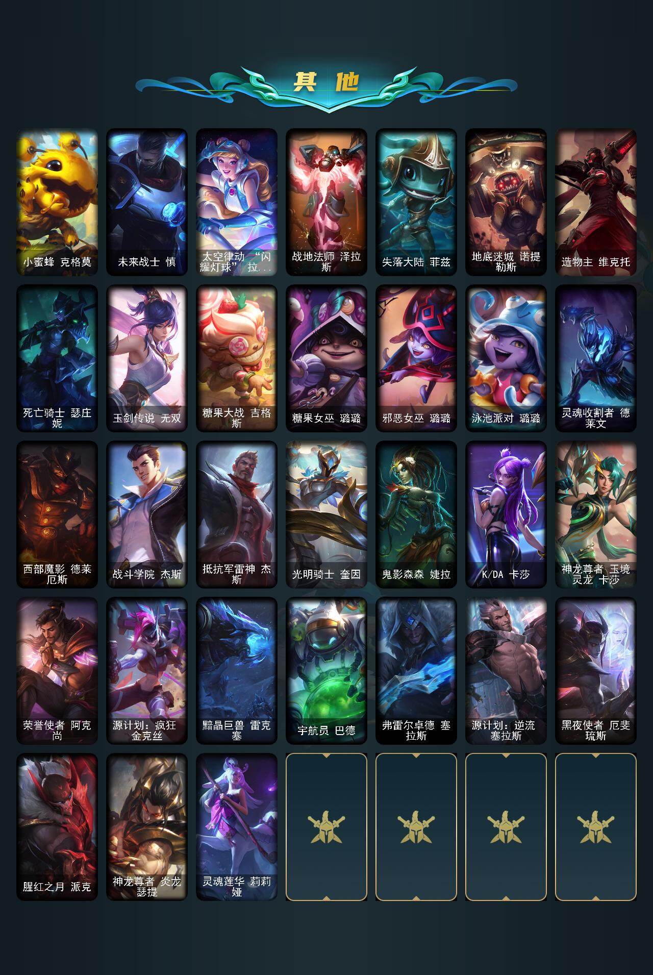 【传说皮肤】:魔幻卡牌崔斯特,血石领主弗拉基米尔,大天使长米迦勒凯尔,恶魔男爵瑞兹,源计划联合艾希,西部天使艾希,双重冰晶艾尼维亚,灵能特工娑娜,冰霜之刃艾瑞莉娅,女主播迦娜,最终BOSS维迦,未来战士凯特琳,神拳李青,神龙尊者圣龙李青,银河魔装机神兰博,炼狱魔犬内瑟斯,源计划超体莫德凯撒,死亡骑士盖伦,黎明使者锐雯,星之守护者拉克丝,符文战熊沃利贝尔,苍穹之光韦鲁斯,金牌主播德莱文,霸天异形卡兹克,神王德莱厄斯,蔷薇绅士杰斯,星之守护者卡莎,黑夜使者亚索,西部魔影卢锡安,天煞劫,真实伤害艾克
