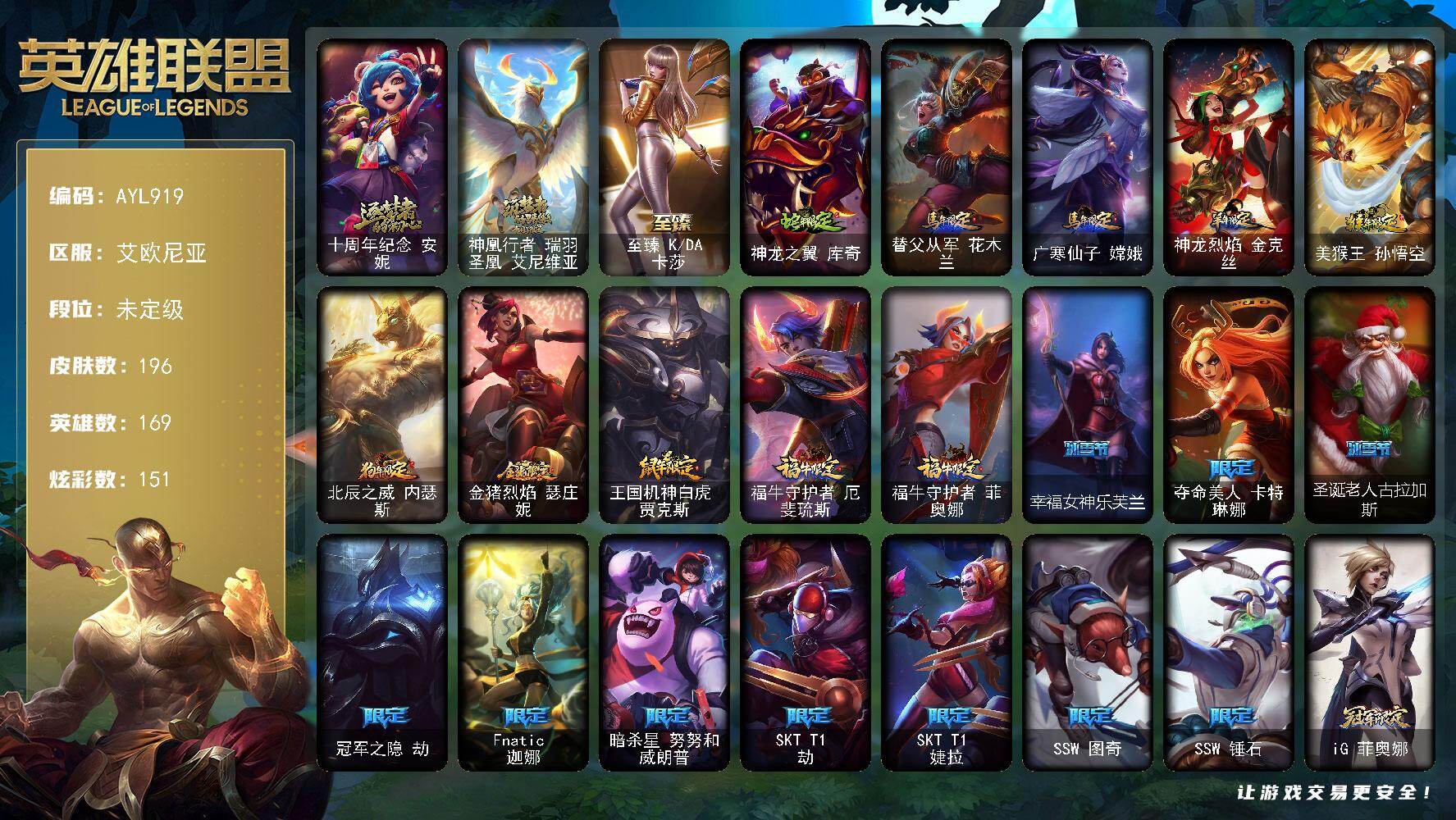 [17864750]未定级段位-169英雄-196皮肤-151炫彩-0终极-3神话-44限定-31传说-47史诗 【热门头像】:觅心游侠卢锡安头像 【神话皮肤】:十周年纪念安妮,神凰行者瑞羽圣凰艾尼维亚 【至臻皮肤】:至臻KDA卡莎 【臻彩皮肤】:偶像歌手阿狸极地雪莲,神龙尊者圣龙李青龙腾云起 【年限皮肤】:神龙之翼库奇,替父从军花木兰,广寒仙子嫦娥,神龙烈焰金克丝,美猴王孙悟空,北辰之威内瑟斯,金猪烈焰瑟庄妮,王国机神白虎贾克斯,福牛守护者厄斐琉斯,福牛守护者菲奥娜 【冰雪限定】:幸福女神乐芙兰,夺命美人卡特琳娜,圣诞老人古拉加斯 【限定皮肤】:冠军之隐劫,Fnatic迦娜,暗杀星努努和威朗普,SKTT1劫,SKTT1婕拉,SSW图奇,SSW锤石,iG菲奥娜,DWG奈德丽,玉剑传说舞剑仙,星之守护者佐伊,胜利之剑亚托克斯,胜利枪神卢锡安,胜利凤凰艾尼维亚,胜利之王泰达米尔,胜利巨口克格莫,胜利女神娑娜,胜利剑圣易,胜利之运崔斯特,伯爵卡萨丁,魅惑女巫莫甘娜,魅惑女巫菲奥娜,泳池派对塔莉垭,蓝色忧郁崔斯特,密林猎手提莫,暗影沃里克,波比的巧克力工坊,勇者奈德丽,防暴机器人布里茨,防暴士兵格雷福斯 【传说皮肤】:魔幻卡牌崔斯特,血石领主弗拉基米尔,大天使长米迦勒凯尔,恶魔男爵瑞兹,源计划联合艾希,西部天使艾希,双重冰晶艾尼维亚,灵能特工娑娜,冰霜之刃艾瑞莉娅,女主播迦娜,最终BOSS维迦,未来战士凯特琳,神拳李青,神龙尊者圣龙李青,银河魔装机神兰博,炼狱魔犬内瑟斯,源计划超体莫德凯撒,死亡骑士盖伦,黎明使者锐雯,星之守护者拉克丝,符文战熊沃利贝尔,苍穹之光韦鲁斯,金牌主播德莱文,霸天异形卡兹克,神王德莱厄斯,蔷薇绅士杰斯,星之守护者卡莎,黑夜使者亚索,西部魔影卢锡安,天煞劫,真实伤害艾克 【史诗皮肤】:摄魂男爵弗拉基米尔,战争机器赛恩,钢铁之心希维尔,兔宝宝提莫,黑帮狂花厄运小姐,紫晶射手艾希,黑色荆棘莫甘娜,特种部队普朗克,抵抗军天使凯特琳,黑曜石守护者墨菲特,霸天巨兽墨菲特,无畏号墨菲特,符文战神雷克顿,枯萎之壤雷克顿,三昧真火孙悟空,至高之拳李青,屠龙勇士薇恩,苍穹之光薇恩,法老王朝内瑟斯,铁血猎手奈德丽,银色之牙阿卡丽,刺客信条凯南,铁甲雄心盖伦,刺客信条锐雯,腥红之月鬼武者慎,奥术光辉拉克丝,沙之守护泽拉斯,银河魔装机神希瓦娜,黑帮教父格雷福斯,虚空海灵菲兹,铁血猎人雷恩加尔