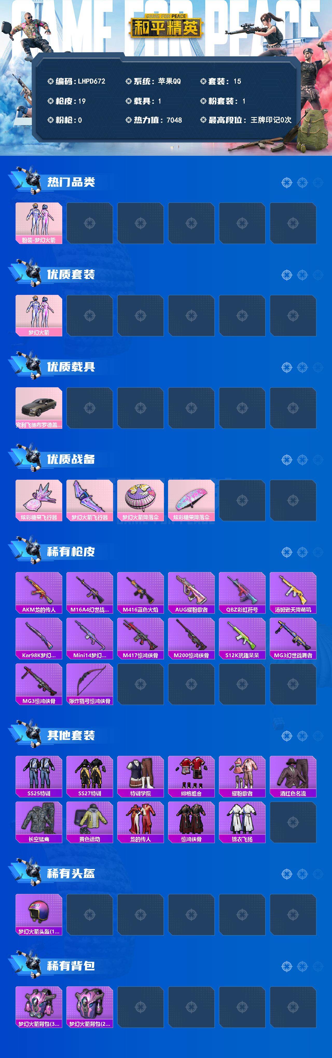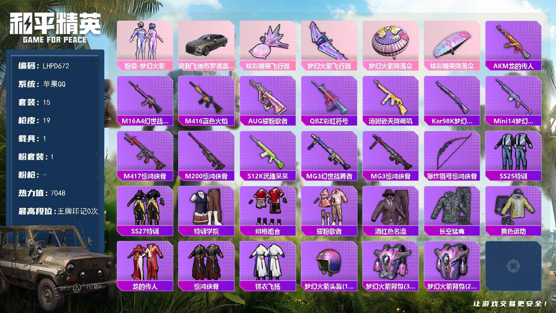 [17864948]苹果 手Q-1粉装-0特效枪-1载具-2粉色飞行器-7048热力值-1王牌印记-15套装-19枪皮 【热门品类】:粉装-梦幻火箭【粉色套装】:粉装-梦幻火箭【粉色载具】:宾利飞驰(布罗德盖棕双色)【粉色飞行器】:炫彩糖果飞行器,梦幻火箭飞行器