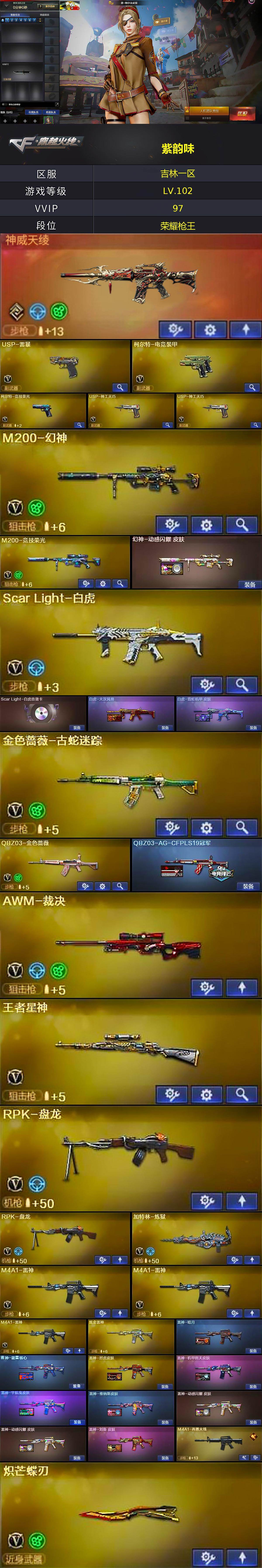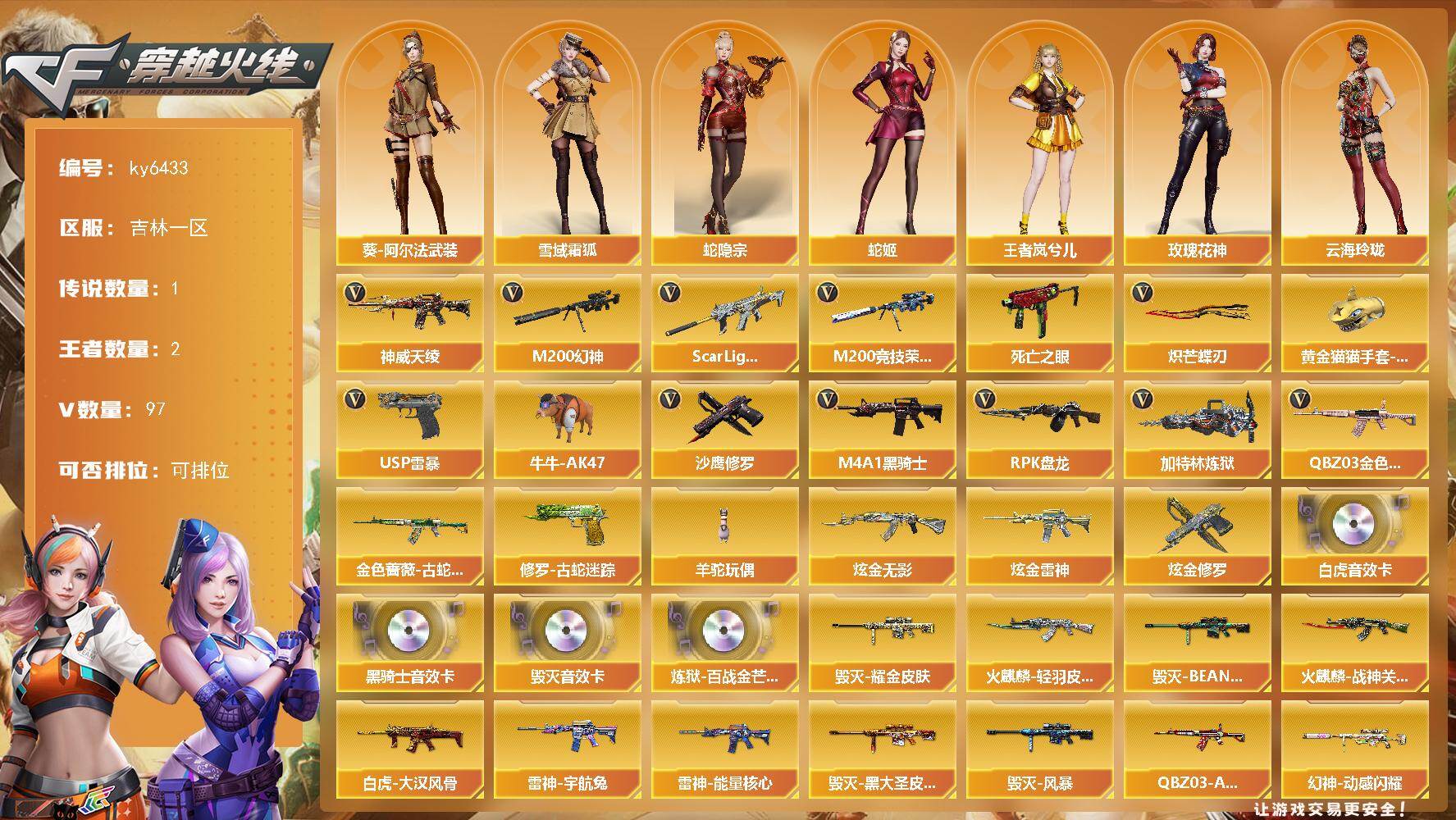 [17868293]【ky6433】吉林一区-95V-2王者武器数-4炫金武器数 【传说武器】:神威天绫 【热门武器】:QBZ03-金色蔷薇,Scar Light-白虎,M200-幻神,金色蔷薇-古蛇迷踪,修罗-古蛇迷踪,M200-竞技荣光,死亡之眼*4,牛牛-AK47,M4A1-黑骑士,RPK-盘龙*2,加特林-炼狱,羊驼玩偶,USP-雷暴,沙鹰-修罗*3,炽芒蝶刃,黄金猫猫手套-白鲨 【王者炫金武器】:炫金无影,炫金雷神,炫金修罗*2 【音效卡】:M4A1-黑骑士音效卡,Barrett-毁灭音效卡,Scar Light-白虎音效卡,炼狱-百战金芒-庆典舞曲音效卡 【皮肤】:幻神-动感闪耀 皮肤,白虎-大汉风骨,白虎-霓虹机甲 皮肤,QBZ03-AG-CFPLS19冠军,雷神-暗月,雷神-能量核心,雷神-烈虎皮肤,雷神-机甲刑天皮肤,雷神-宇航兔皮肤,雷神-维纳斯皮肤,雷神-动感闪耀 皮肤*2,雷神-刘备 皮肤,M4A1-再燃火线,火麒麟-雷神,火麒麟-轻羽皮肤,火麒麟-战神关羽,火麒麟-平天大圣,火麒麟-心动糖果,毁灭耀金皮肤,毁灭-BEAN-2020MVP,毁灭-黑大圣皮肤,毁灭-风暴,黑龙-能量核心,战神-粉色甜心皮肤,战神-紫绶金章皮肤,战神-流金岁月皮肤,AK47-B-常胜将军-孙权,AWM-天龙-传奇70KG,炼狱-星空,修罗-能量核心*2,屠龙-巅峰荣耀 皮肤,轻型军用手斧-再燃火线 【角色】:魅影,电竞教官-云悠悠,兰-巾帼英雄,晴雅,王者葵-惊若翩鸿,王者凌霄,王者岚兮儿,雪域霜狐,蛇隐宗,乔伊教练,云海玲珑,葵-阿尔法武装,北极狐-X,芳心审判者,风暴女*2,虎妞,嘉年华灵狐,麻雀,曼陀罗-X,玫瑰花神,潘多拉-X,潘多拉-甜心教官,蛇姬,斯沃特-X,铁骑荣耀,兔囡囡,雪莉杨,樱-战斗天使 【人偶武器】:天龙-曼陀罗,火麒麟-灵狐,王者Barrett-英勇金戈,M4A1-雷神-精英刀锋,迷你钢铁终结者,迷你救赎猎手,AWM-灵狐-15周年嘉年华,牛牛-AK47,生化手雷-机甲核心*3,闪光弹-小乔,迷你超能女侍 【暴走生化】:死亡之眼*4,超级对讲机 【挑战大师】:冰龙粉碎者-白马银枪*2,激光毁灭者III-白马银枪,激光毁灭者III,神圣爆裂者-末日III 【英雄级武器】:AK47-火麒麟*3,M4A1-黑龙,M4A1-雷神*3,M4A1-黑骑士,AK47-无
