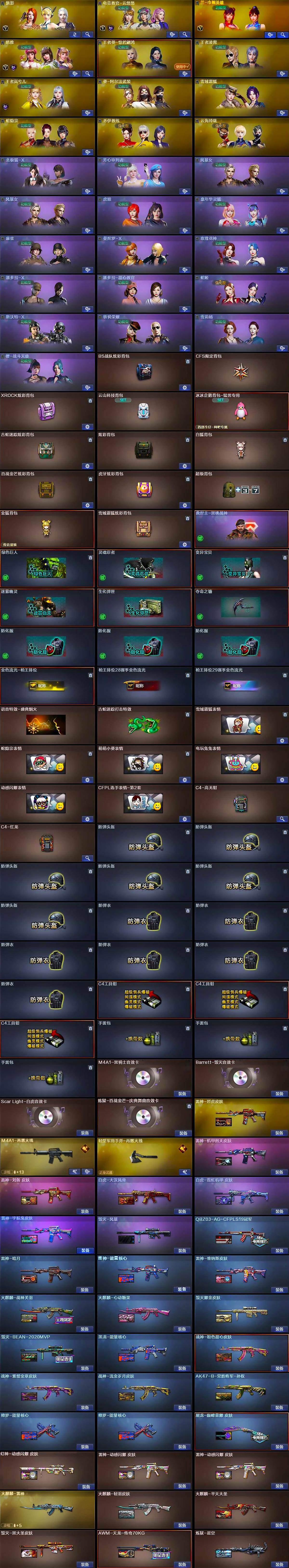 【皮肤】:幻神-动感闪耀 皮肤,白虎-大汉风骨,白虎-霓虹机甲 皮肤,QBZ03-AG-CFPLS19冠军,雷神-暗月,雷神-能量核心,雷神-烈虎皮肤,雷神-机甲刑天皮肤,雷神-宇航兔皮肤,雷神-维纳斯皮肤,雷神-动感闪耀 皮肤*2,雷神-刘备 皮肤,M4A1-再燃火线,火麒麟-雷神,火麒麟-轻羽皮肤,火麒麟-战神关羽,火麒麟-平天大圣,火麒麟-心动糖果,毁灭耀金皮肤,毁灭-BEAN-2020MVP,毁灭-黑大圣皮肤,毁灭-风暴,黑龙-能量核心,战神-粉色甜心皮肤,战神-紫绶金章皮肤,战神-流金岁月皮肤,AK47-B-常胜将军-孙权,AWM-天龙-传奇70KG,炼狱-星空,修罗-能量核心*2,屠龙-巅峰荣耀 皮肤,轻型军用手斧-再燃火线