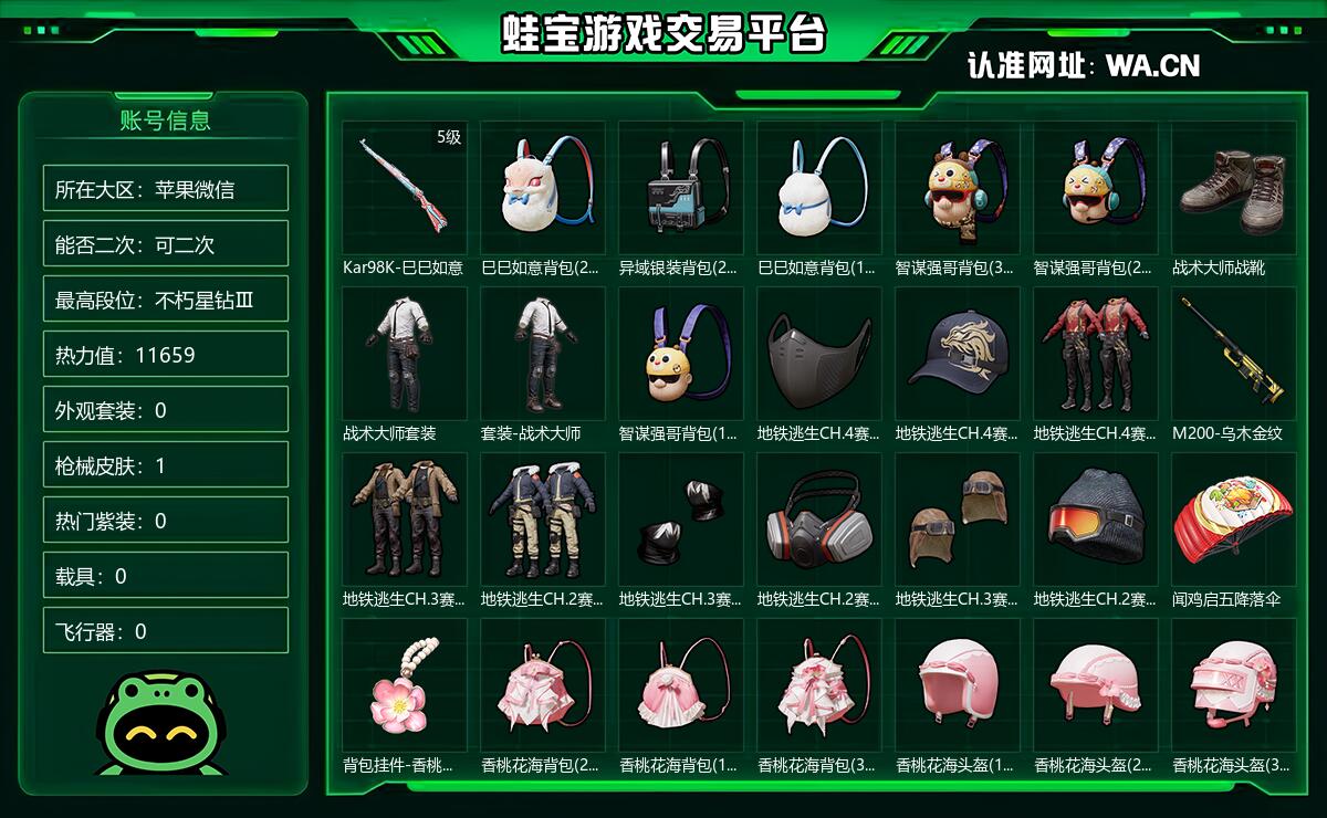 苹果微信 可二次 当前段位英勇黄金Ⅲ 历史最高段位不朽星钻Ⅲ 热力值11659 等级43 套装29 王牌次数-2 点券10 外观套装0 枪械皮肤1 热门紫装0 载具0 飞行器0 稀有0 头盔0 背包0