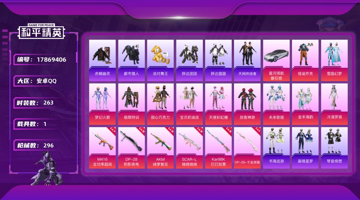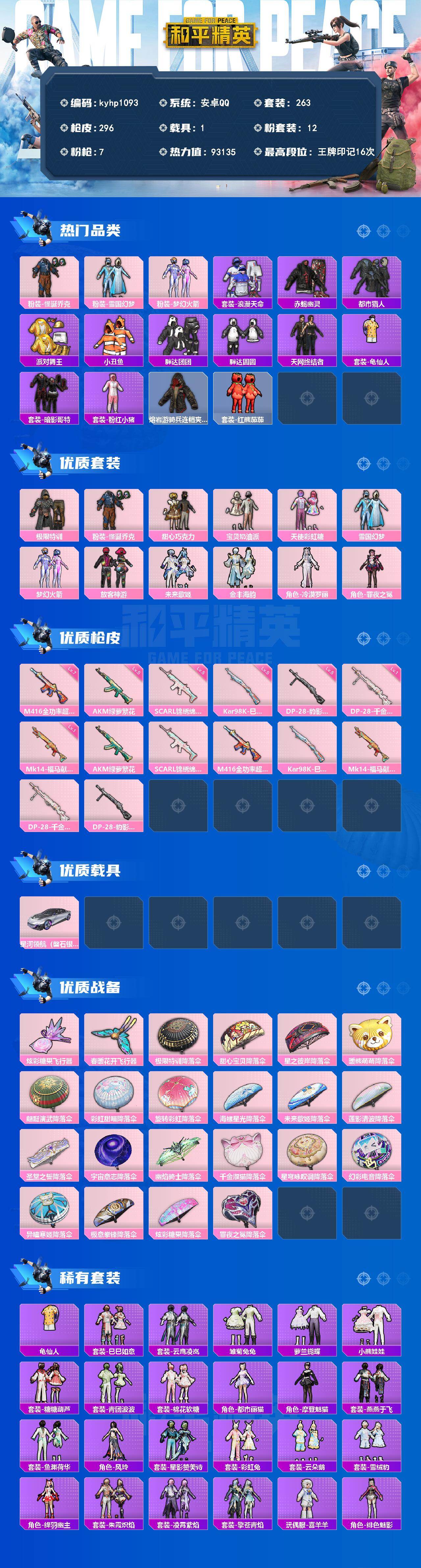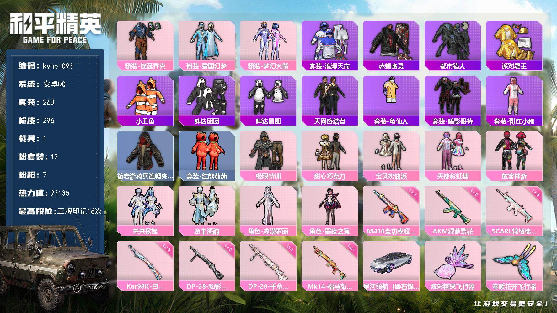 [17869406]安卓 手Q-12粉装-7特效枪-1载具-2粉色飞行器-93135热力值-16王牌印记-263套装-296枪皮