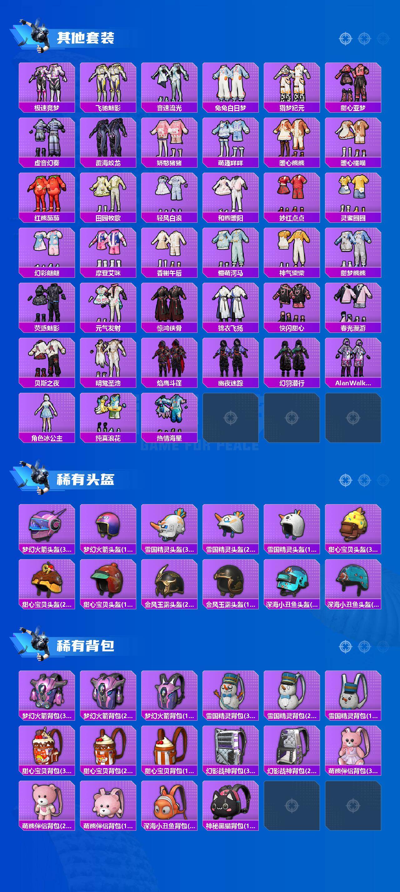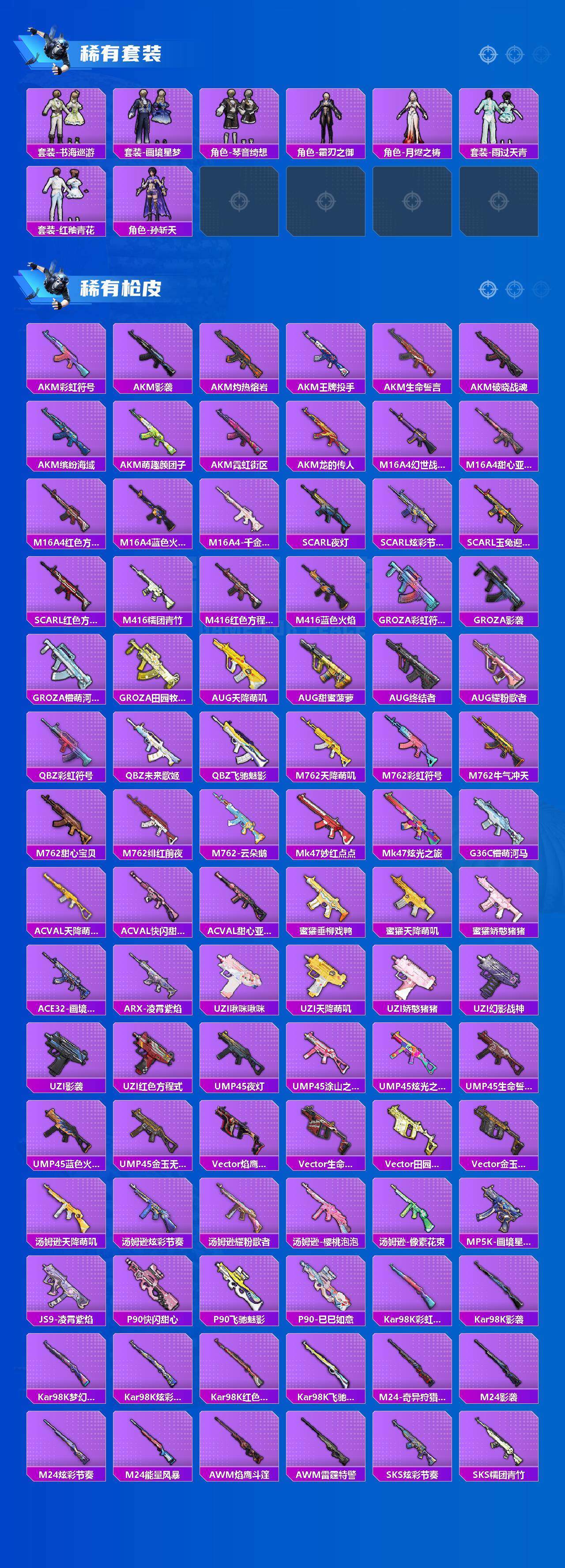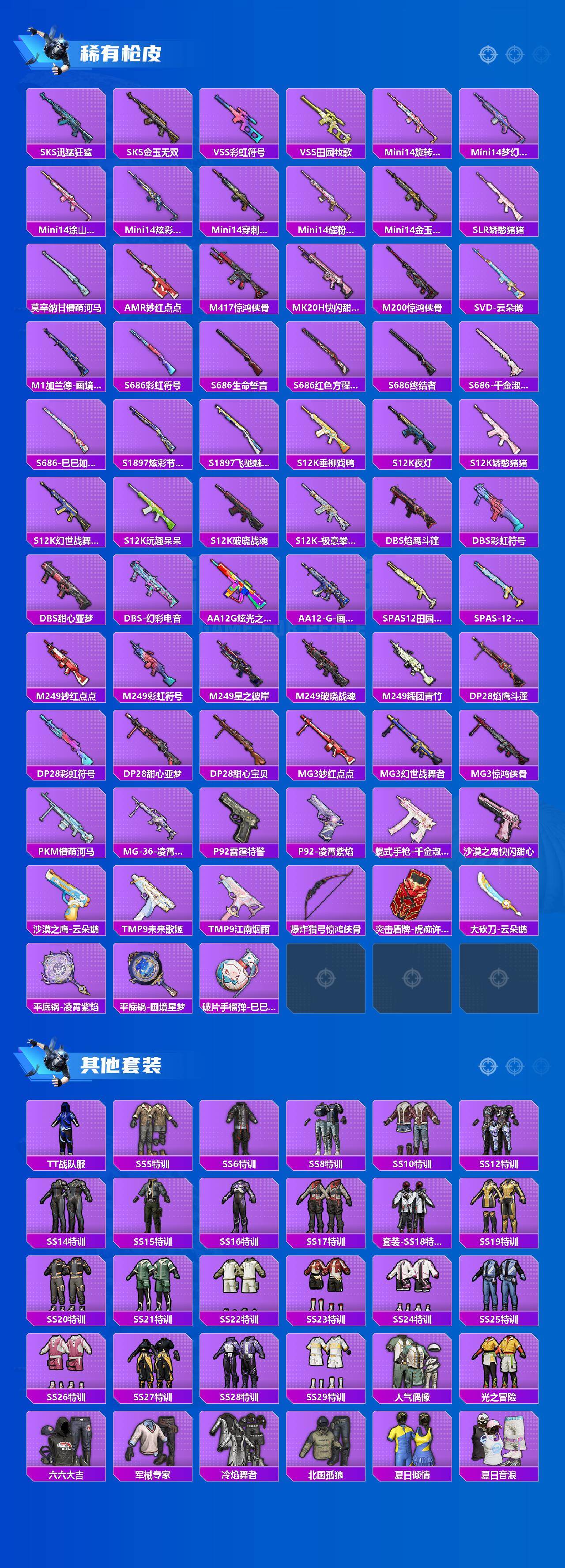 - [12084094]6粉装 9特效枪 3载具 5印记 可二次 可修改实名 战神框 优质装备:宝马M4(圣保罗黄),雪月幻音,MK12-雪月幻音,星穹咏叹调,AKS-74U-星穹咏叹调,幻彩电音,MG-36-幻彩电音,冷漠罗丽,P90-冷漠罗丽,烟雾弹-电雾迷城,罗征,破片手榴弹-美味星星糖,M416-灵猫魔法师,羊梦糖心,Kar98K-巳巳如意 稀有枪皮:DP-28-豹影疾电 五级特效枪:五级Kar98K-巳巳如意,五级烟雾弹-电雾迷城,五级破片手榴弹-美味星星糖,五级M416-灵猫魔法师,五级DP-28-豹影疾电,五级MK12-雪月幻音,五级AKS-74U-星穹咏叹调 四级特效枪:四级MG-36-幻彩电音,四级P90-冷漠罗丽 紫色装扮:SS31特训套装,霓虹热舞,云朵鹅,彩虹兔,雪绒豹,SS33特训套装,顶瓜瓜,诡诞巡游,混沌火种,时希公主,灵公主,乐音,长空猛禽,缤纷果语,超能勇士,蜜露汐语,鹤鸣,黄色名流,龙魂突击队,柠萌假日,SS29特训,SS28特训,异域银装,竞技名士,SS24特训(SS24特训套装),粉红小猪,焰鹰斗篷,幻羽潜行,SS27特训,大橘大利,星渊小夜曲,星影赞美诗,粉恋花,蓝冰羽,紫幽梦,SS32特训服(SS32特训套装),猎影月神,幽澜祭司 优质战备:镜光幻境降落伞,镜光幻境飞行器(镜光幻境飞行翼),双重狂想降落伞,幻彩电音降落伞,辉羽雀灵降落伞,御兔特攻降落伞,雀灵庇佑飞行器,幻海仙踪降落伞,终晖之翼飞行器,冷漠罗丽降落伞,喜羊羊与灰太狼降落伞,灵猫魔法师飞行器,荧海星豚降落伞,宁雨蝶降落伞,智耀战神降落伞,圣域龙灵降落伞,第五大道降落伞,齐天大圣降落伞