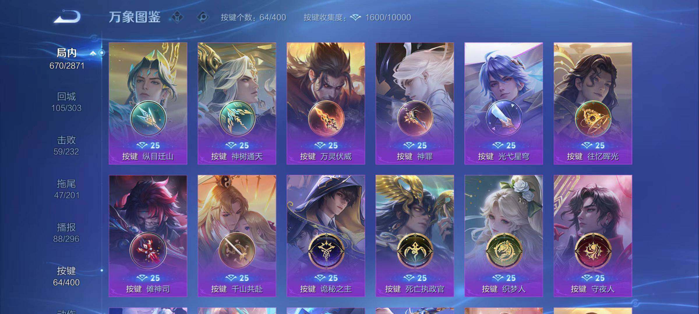米莱狄御霄,夏侯惇朔风刀,明世隐疑决卦,老夫子醍醐杖,鬼谷子原初探秘者,狄仁杰万华元夜,程咬金演武夺筹,钟馗驱傩正仪,苏烈千军破阵,吕布猎兽之王,嬴政白昼王子,女娲朔望之晖,沈梦溪星空之诺,李元芳银河之约,刘邦夺宝奇兵,马可波罗暗影游猎,蒙犽狂想玩偶喵,元歌云间偶戏,弈星混沌棋,达摩沙漠行僧,兰陵王金庭之子,沈梦溪大漠名商,李元芳云中旅人,桑启海盐诗旅,裴擒虎擒涛扼浪,鲁班大师探海日志,张良古海寻踪,项羽苍威无极,镜青焰无极