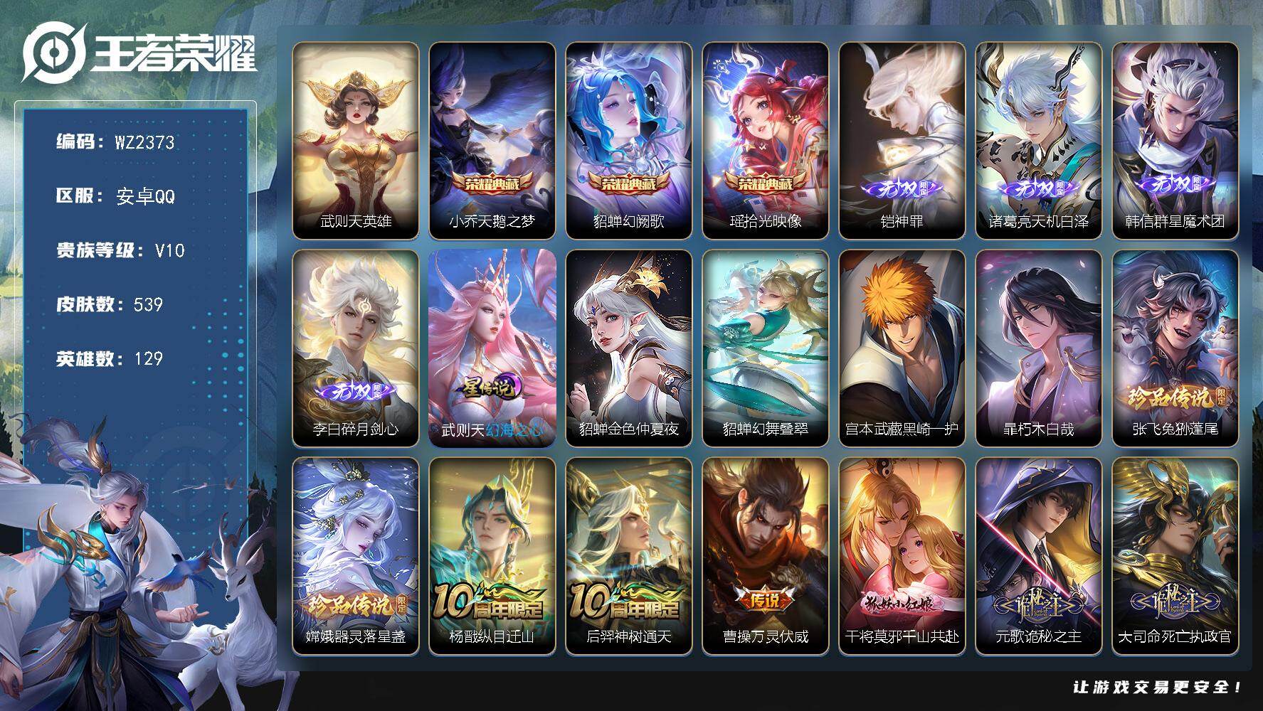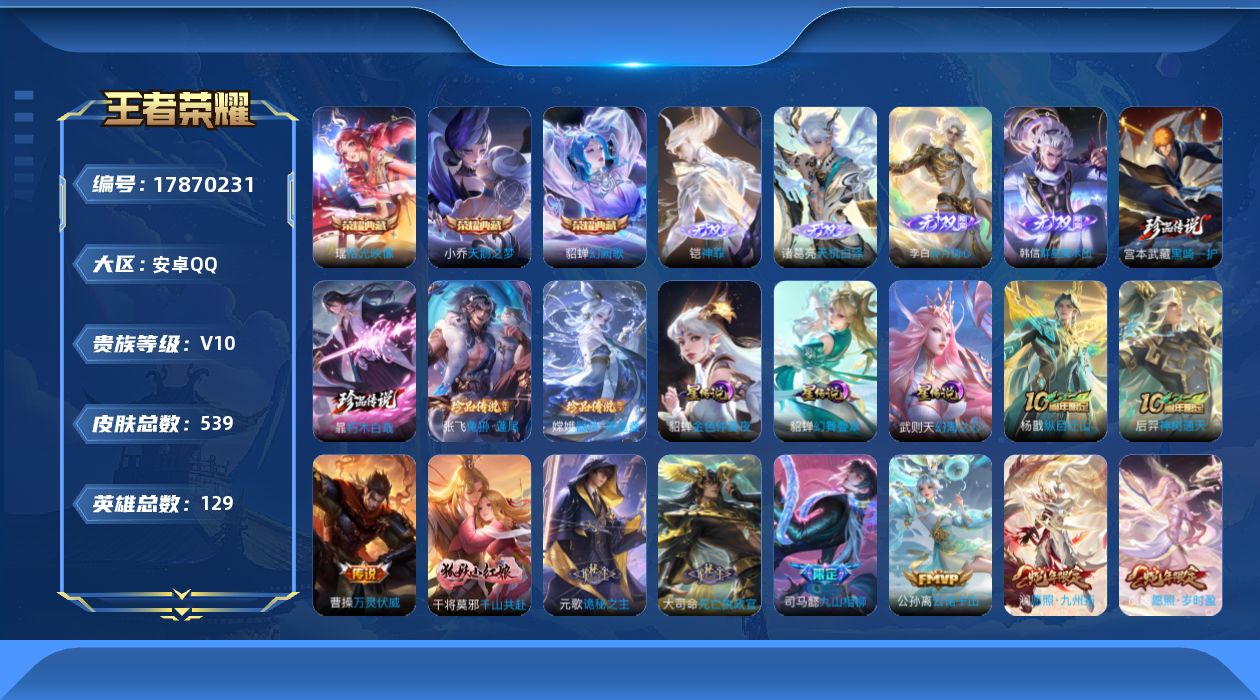[17870231]安卓Q-V10-最强王者段位-129英雄-539皮肤-3典藏皮肤-1典藏英雄-4无双-4珍品传说-58传说-179史诗