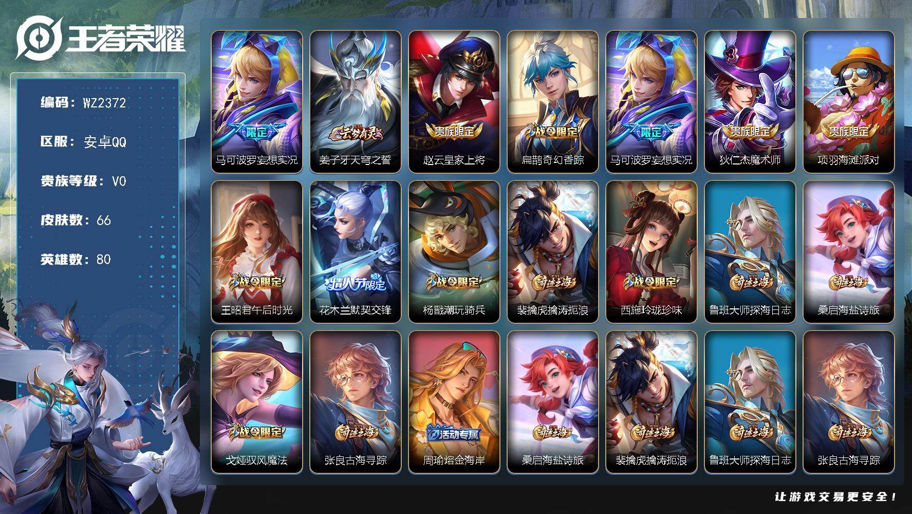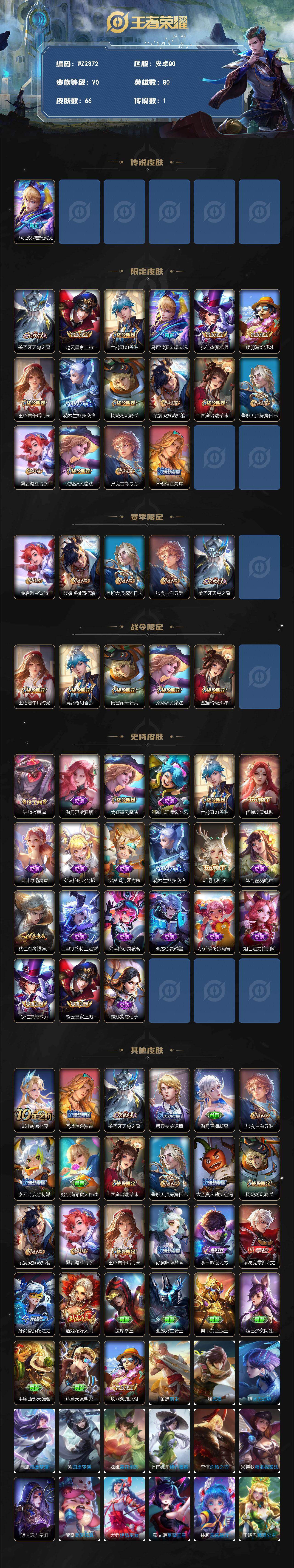 - [14742887]【店主推荐捡漏号!可直接换绑】安卓Q-V8-至尊星耀III段位-123英雄-207皮肤-3典藏皮肤-9传说-40史诗 【英雄全皮】:影全皮 【荣耀典藏】:孙悟空全息碎影,孙尚香杀手不太冷,鲁班七号星空梦想 【传说皮肤】:后羿神树通天,云缨幻光神枪,虞姬启明星使,杨戬永曜之星,诸葛亮武陵仙君,孙尚香末日机甲,宫本武藏地狱之眼,孙悟空地狱火,狄仁杰超时空战士 【限定皮肤】:姜子牙天穹之誓,狄仁杰阴阳师,赵云皇家上将,孙尚香蔷薇恋人,高渐离死亡摇滚,芈月重明,夏侯惇朔风刀,曹操烛龙,典韦穷奇,典韦蓝屏警告,狄仁杰魔术师,狄仁杰万华元夜,达摩沙漠行僧,项羽海滩派对,老夫子醍醐杖,关羽冰锋战神,程咬金演武夺筹,兰陵王金庭之子,花木兰青春决赛季,牛魔御旌,后羿辉光之辰,李元芳云中旅人,虞姬霸王别姬,虞姬启明星使,钟馗驱傩正仪,杨玉环遇见飞天,杨戬永曜之星,女娲朔望之晖,蔡文姬繁星吟游,鬼谷子原初探秘者,诸葛亮武陵仙君,苏烈千军破阵,弈星混沌棋,沈梦溪大漠名商,明世隐疑决卦,裴擒虎李小龙,裴擒虎擒涛扼浪,狂铁御狮,米莱狄御霄,盾山御銮,上官婉儿梁祝,鲁班大师探海日志,桑启海盐诗旅,张良古海寻踪,裴擒虎梅西,鬼谷子天穹祈灯,刘邦剑破天穹 【年限皮肤】:杨戬永曜之星,后羿辉光之辰 【赛季限定】:芈月重明,夏侯惇朔风刀,曹操烛龙,典韦穷奇,狄仁杰万华元夜,达摩沙漠行僧,老夫子醍醐杖,程咬金演武夺筹,兰陵王金庭之子,张良古海寻踪,牛魔御旌,李元芳云中旅人,钟馗驱傩正仪,鬼谷子原初探秘者,苏烈千军破阵,弈星混沌棋,沈梦溪大漠名商,明世隐疑决卦,裴擒虎擒涛扼浪,狂铁御狮,米莱狄御霄,盾山御銮,鲁班大师探海日志,桑启海盐诗旅,鬼谷子天穹祈灯,刘邦剑破天穹,姜子牙天穹之誓 【战令限定】:典韦蓝屏警告,女娲朔望之晖 【史诗皮肤】:阿轲暗夜猫娘,赵云皇家上将,貂蝉圣诞恋歌,甄姬冰雪圆舞曲,王昭君偶像歌手,狄仁杰魔术师,宫本武藏鬼剑武藏,孙尚香蔷薇恋人,孙尚香水果甜心,嬴政摇滚巨星,妲己魅力维加斯,妲己女仆咖啡,墨子龙骑士,墨子金属风暴,吕布圣诞狂欢,曹操幽灵船长,李白千年之狐,张飞乱世虎臣,虞姬霸王别姬,关羽冰锋战神,刘邦德古拉伯爵,小乔缤纷独角兽,兰陵王暗隐猎兽者,诸葛亮黄金分割率,雅典娜冰冠公主,后羿辉光之辰,花木兰青春决赛季,铠曙光守护者,裴擒虎梅西,白起星夜王子,杨玉环遇见飞天,大乔猫狗日