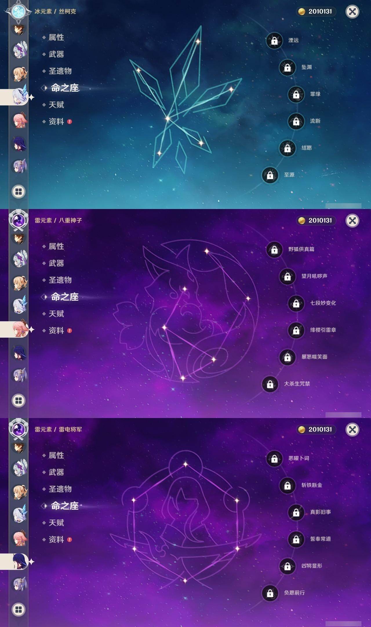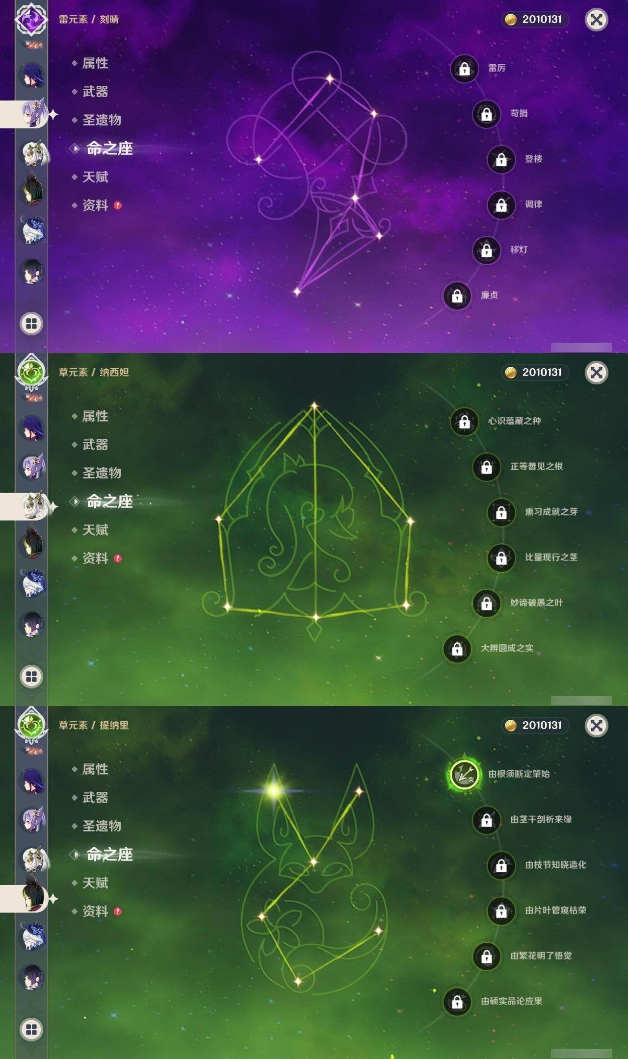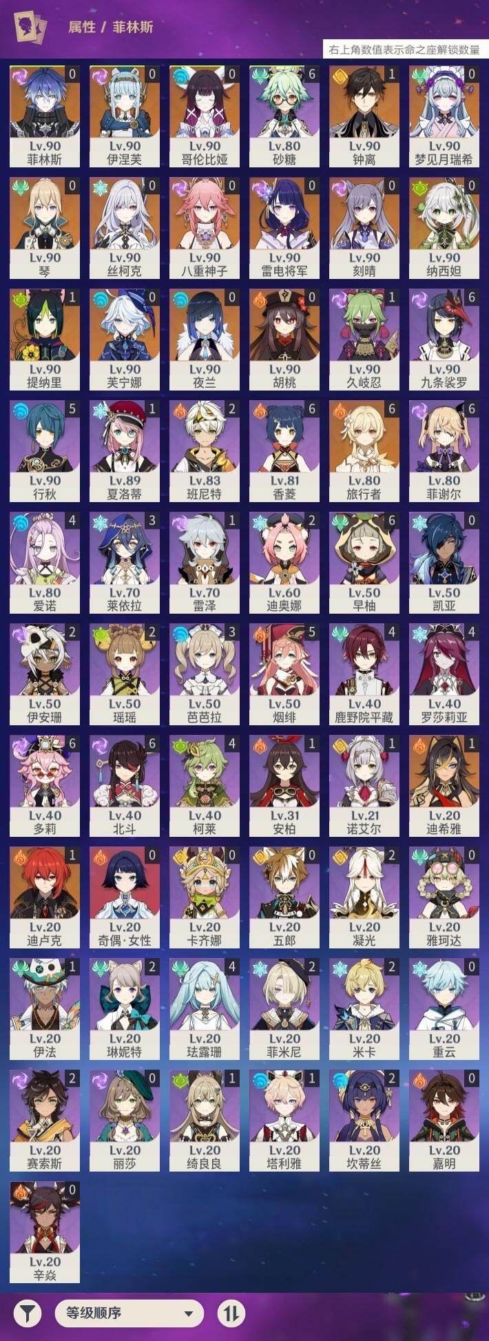 - [15563114]60级/39黄/女主/23个五星角色/9个五星武器 0命阿蕾奇诺,0命闲云,0命那维莱特,0命迪希雅,0命艾尔海森,0命纳西妲,0命神里绫人,0命雷电将军,0命枫原万叶,0命神里绫华,0命钟离,0命胡桃,0命魈,0命可莉,0命达达利亚,0命珊瑚宫心海,3命刻晴,2命七七,2命琴,0命莫娜,0命迪卢克,0命希诺宁,0命玛拉妮,精1鹤鸣余音,精1万世流涌大典,精1千夜浮梦,精1波乱月白经津,精1和璞鸢,精1天空之脊,精1天空之翼,精1天空之卷