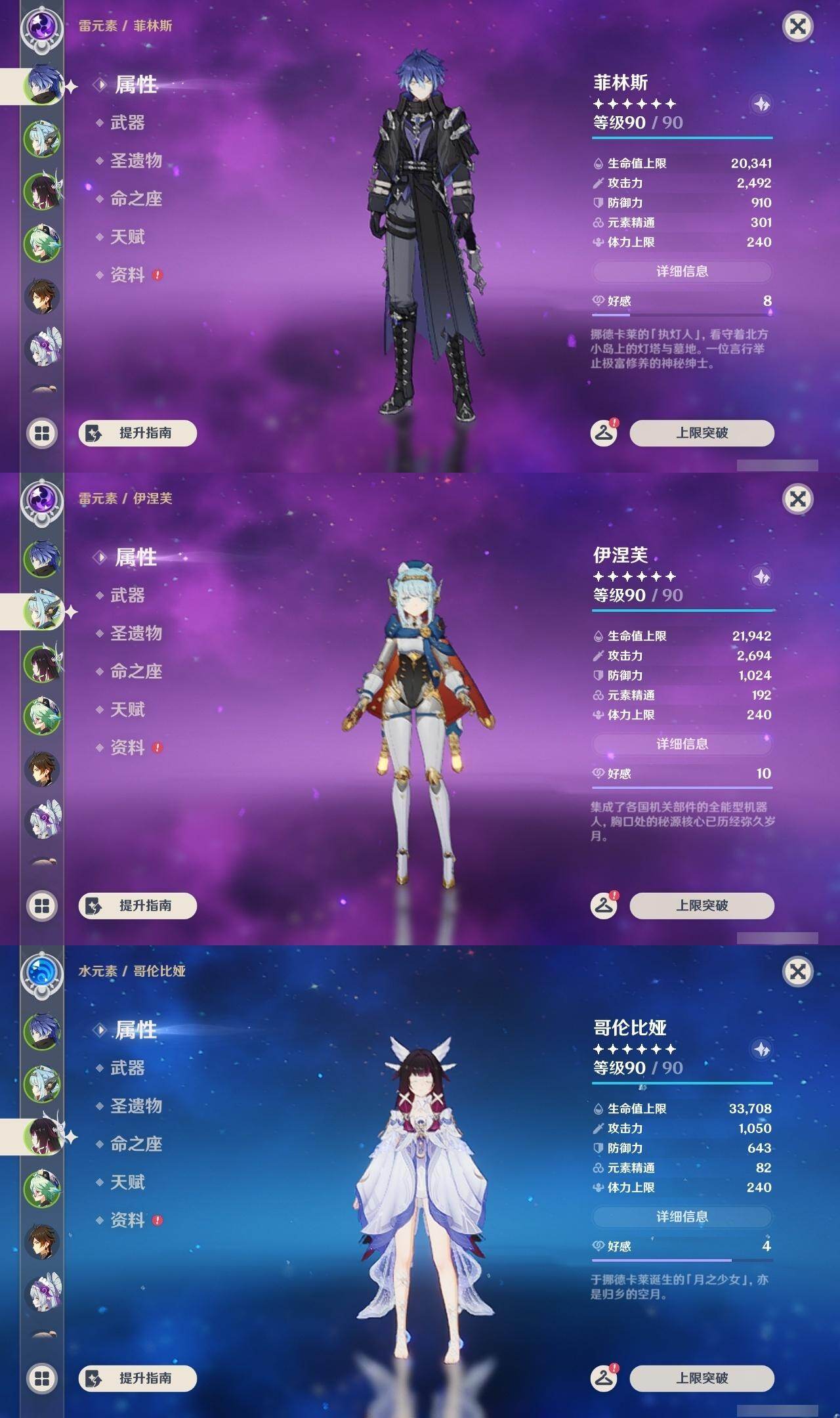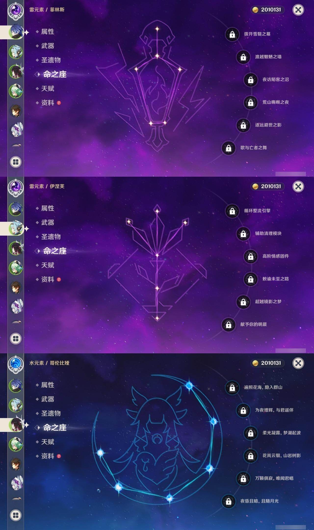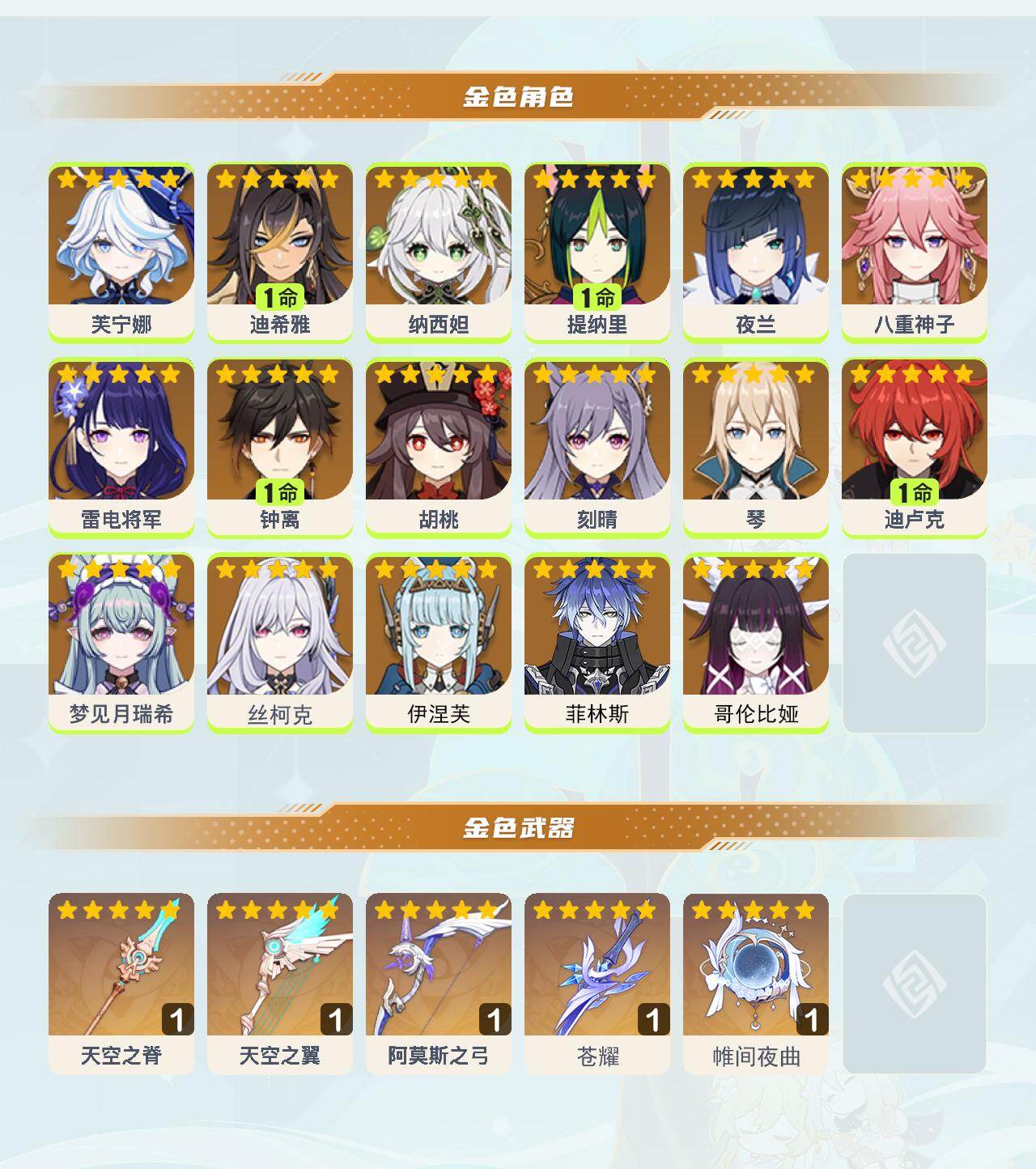 0命芙宁娜,1命迪希雅,0命纳西妲,1命提纳里,0命夜兰,0命八重神子,0命雷电将军,1命钟离,0命胡桃,0命刻晴,0命琴,1命迪卢克,0命梦见月瑞希,0命丝柯克,0命伊涅芙,0命菲林斯,0命哥伦比娅,精1天空之脊,精1天空之翼,精1阿莫斯之弓,精1苍耀,精1帷间夜曲