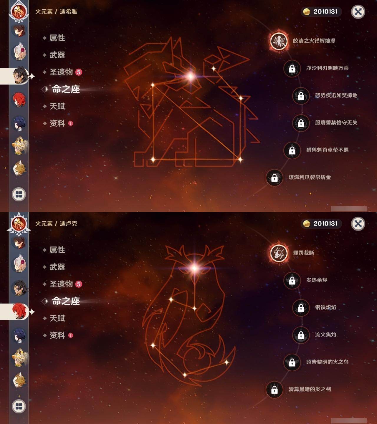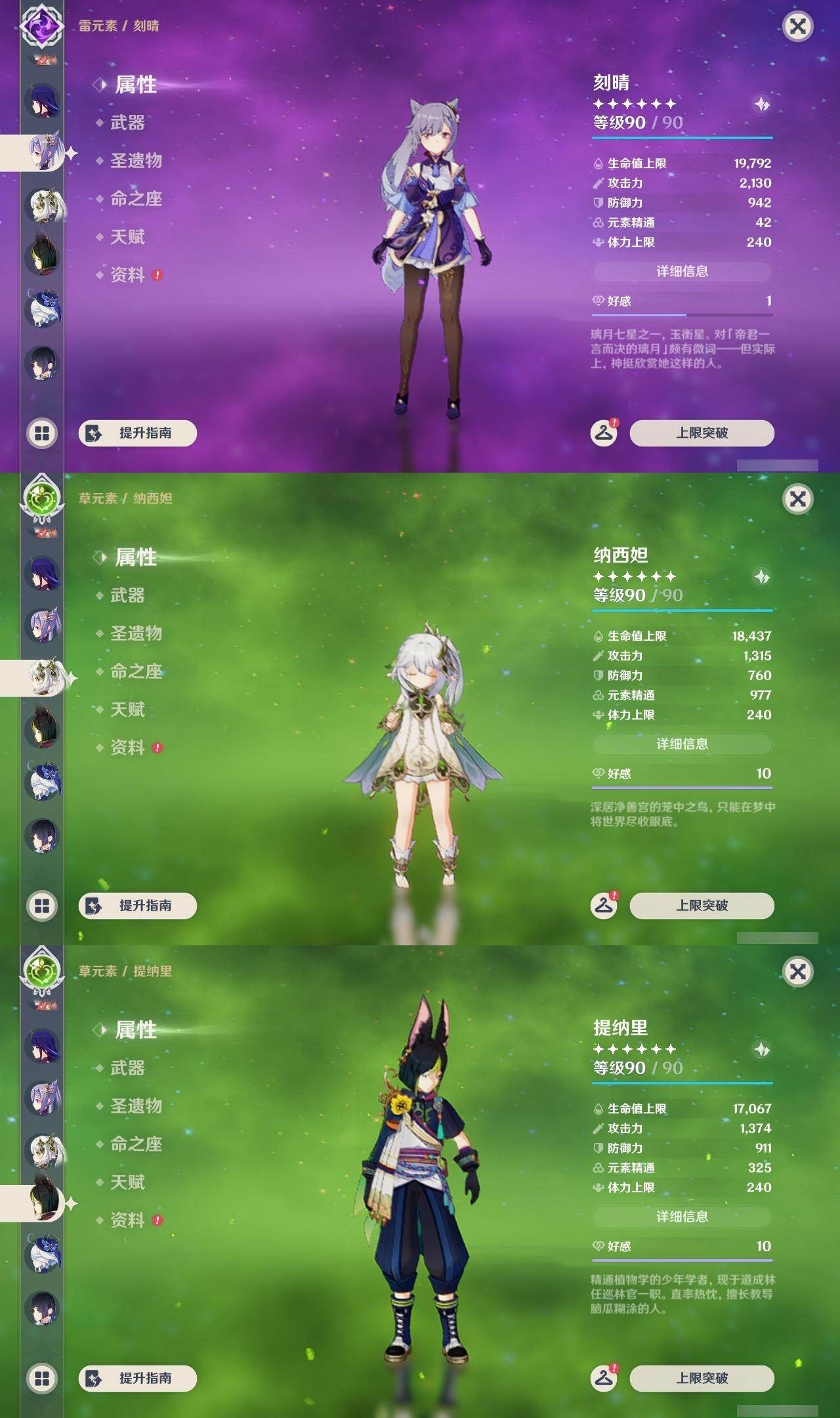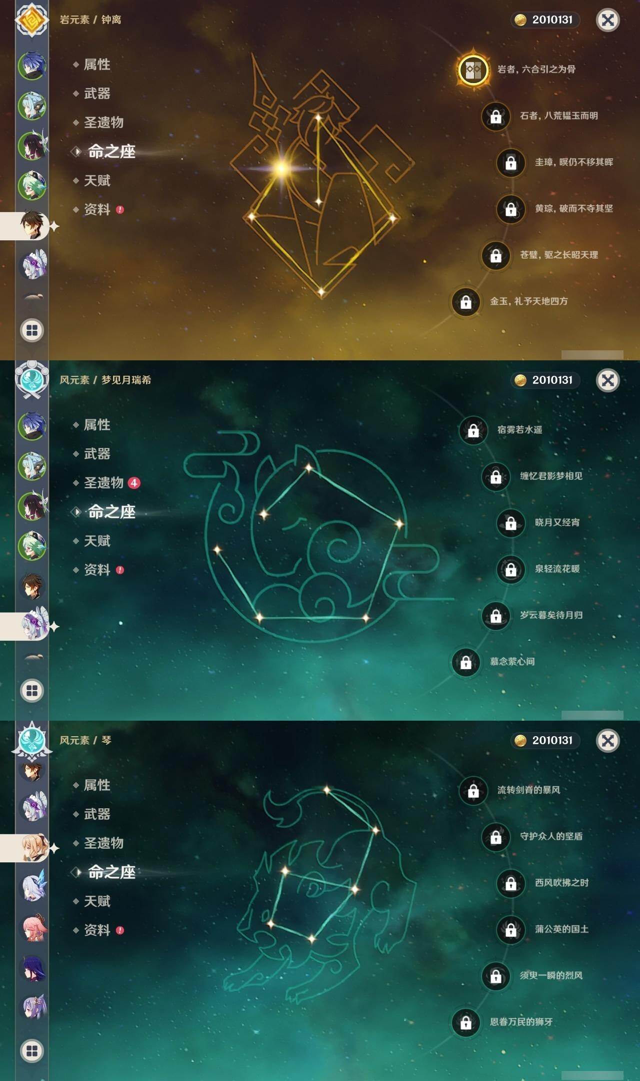 0命芙宁娜,1命迪希雅,0命纳西妲,1命提纳里,0命夜兰,0命八重神子,0命雷电将军,1命钟离,0命胡桃,0命刻晴,0命琴,1命迪卢克,0命梦见月瑞希,0命丝柯克,0命伊涅芙,0命菲林斯,0命哥伦比娅,精1天空之脊,精1天空之翼,精1阿莫斯之弓,精1苍耀,精1帷间夜曲