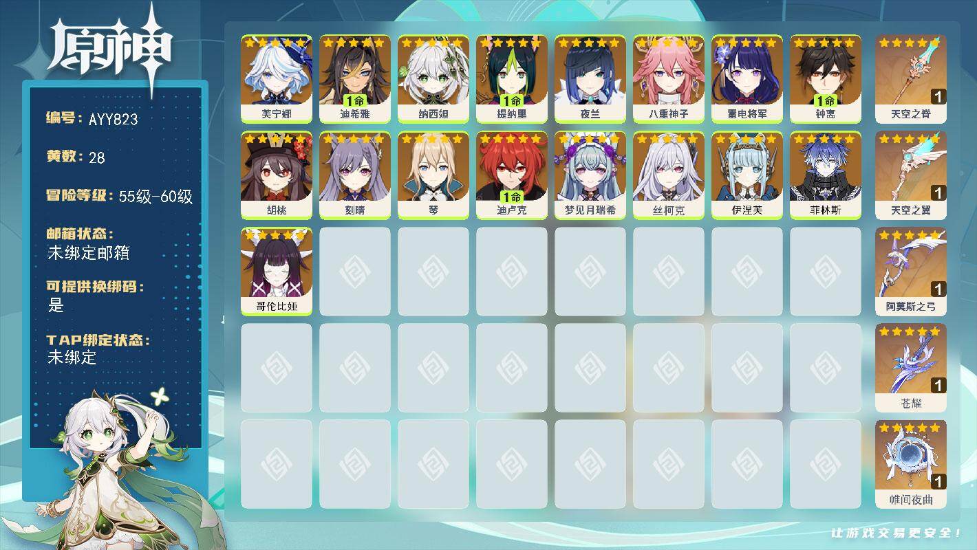 [17870416]59级/28黄/女主/17个五星角色/7个五星武器 0命芙宁娜,1命迪希雅,0命纳西妲,1命提纳里,0命夜兰,0命八重神子,0命雷电将军,1命钟离,0命胡桃,0命刻晴,0命琴,1命迪卢克,0命梦见月瑞希,0命丝柯克,0命伊涅芙,0命菲林斯,0命哥伦比娅,精1天空之脊,精1天空之翼,精1阿莫斯之弓,精1苍耀,精1帷间夜曲