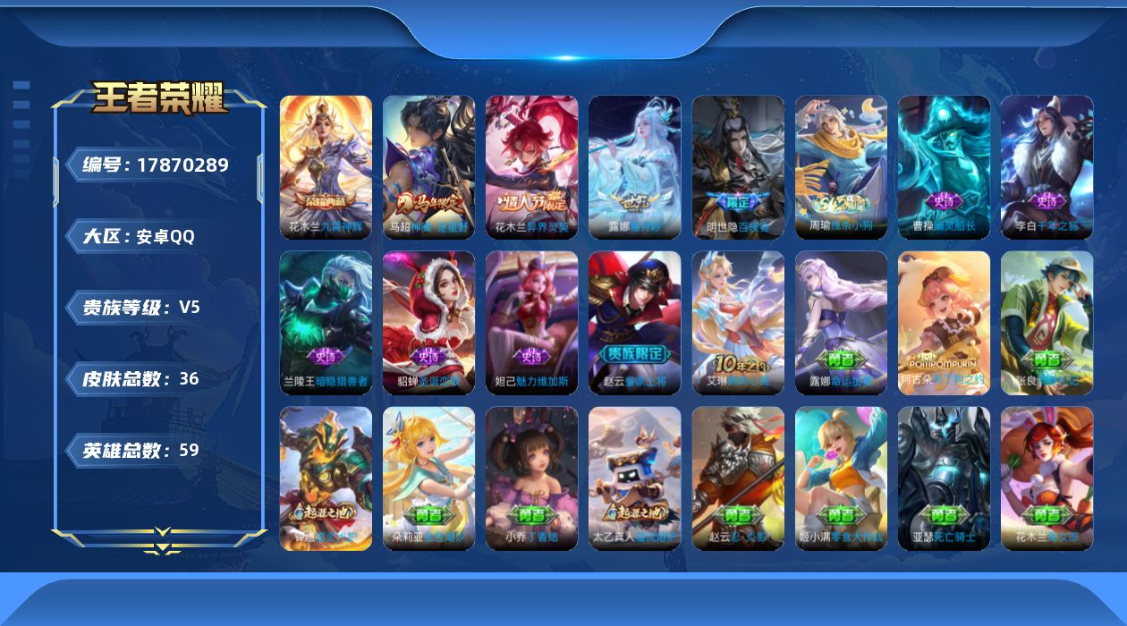 - PX_2093862-实名: 可修改 贵族等级: V6 英雄数: 105 皮肤数: 80 传说皮: 时之恋人-刘备 限定皮: 异界灵契,青春决赛季,朱雀志,一生所爱,傲雪梅枪,时之祈愿-云中君