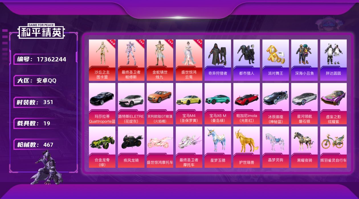 [17362244]【特价出售/店主推荐】安卓 手Q-5神装-20粉装-28特效枪-19载具-22粉色飞行器-183428热力值-20王牌印记-351套装-467枪皮
