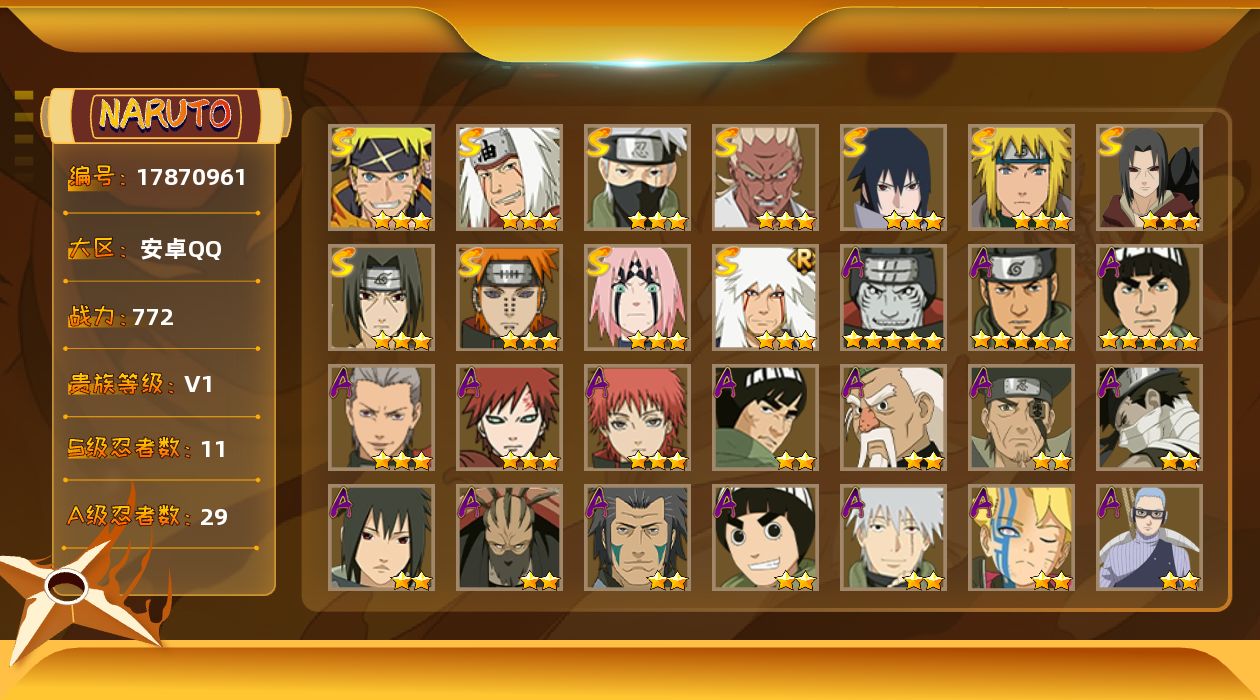 [17870961]11S级忍者数-29A级忍者数 【S级忍者】:宇智波鼬「秽土转生」(3星),春野樱「忍界大战」(3星),艾「忍界大战」(3星),宇智波鼬「须佐能乎」(3星),旗木卡卡西「须佐能乎」(3星),自来也「舞之豪杰」(3星),自来也「传说中的三忍」(3星),波风水门(3星),佩恩「天道」(3星),宇智波佐助「永恒万花筒」(3星),漩涡鸣人·宇智波佐助(3星) 【A级忍者】:达鲁伊「博人传」(2星),迪达拉(2星),大蛇丸「晓」(2星),奇拉比「忍界大战」(2星),飞段(3星),飞段「死司凭血」(2星),干柿鬼鲛(5星),漩涡博人「桃式显现」(2星),漩涡鸣人「仙人模式」(2星),迈特凯(5星),旗木卡卡西「幻之真容」(2星),桃地再不斩「秽土转生」(2星),我爱罗「疾风传」(3星),蝎(3星),蝎「绯流琥」(2星),小南「神驹佑将」(2星),猿飞阿斯玛(5星),宇智波鼬(2星),宇智波佐助「须佐能乎」(2星),宇智波佐助「疾风传咒印」(2星),长十郎「六代目水影」(2星),李洛克「忍界大战」(2星),黑土「博人传」(2星),秋道丁次「忍界大战」(2星),土台「忍界大战」(2星),宇智波泉奈(2星),不动(2星),大野木「侠隐江湖」(2星),迈特凯「青春爆炸」(2星)