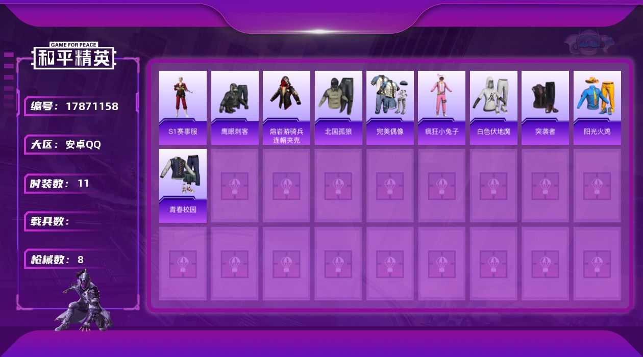 [17871158]安卓 手Q-0粉装-1特效枪-0载具-0粉色飞行器-2153热力值-1王牌印记-11套装-8枪皮 【热门品类】:套装-S1赛事,熔岩游骑兵连帽夹克 【粉色枪皮等级】:ACE32-萌骑漫游(二级) 【粉色枪皮】:ACE32-萌骑漫游 【稀有枪皮】:M416-红色方程式,汤姆逊-像素花束,M417-猪猪侠,DP-28-彩虹符号 【其他套装】:套装-北国孤狼,套装-完美偶像,套装-疯狂小兔子,套装-白色伏地魔,套装-突袭者,套装-阳光火鸡,套装-青春校园,套装-鹰眼刺客 【稀有背包】:金风玉露背包(3级) 【营地ID】:700174212
