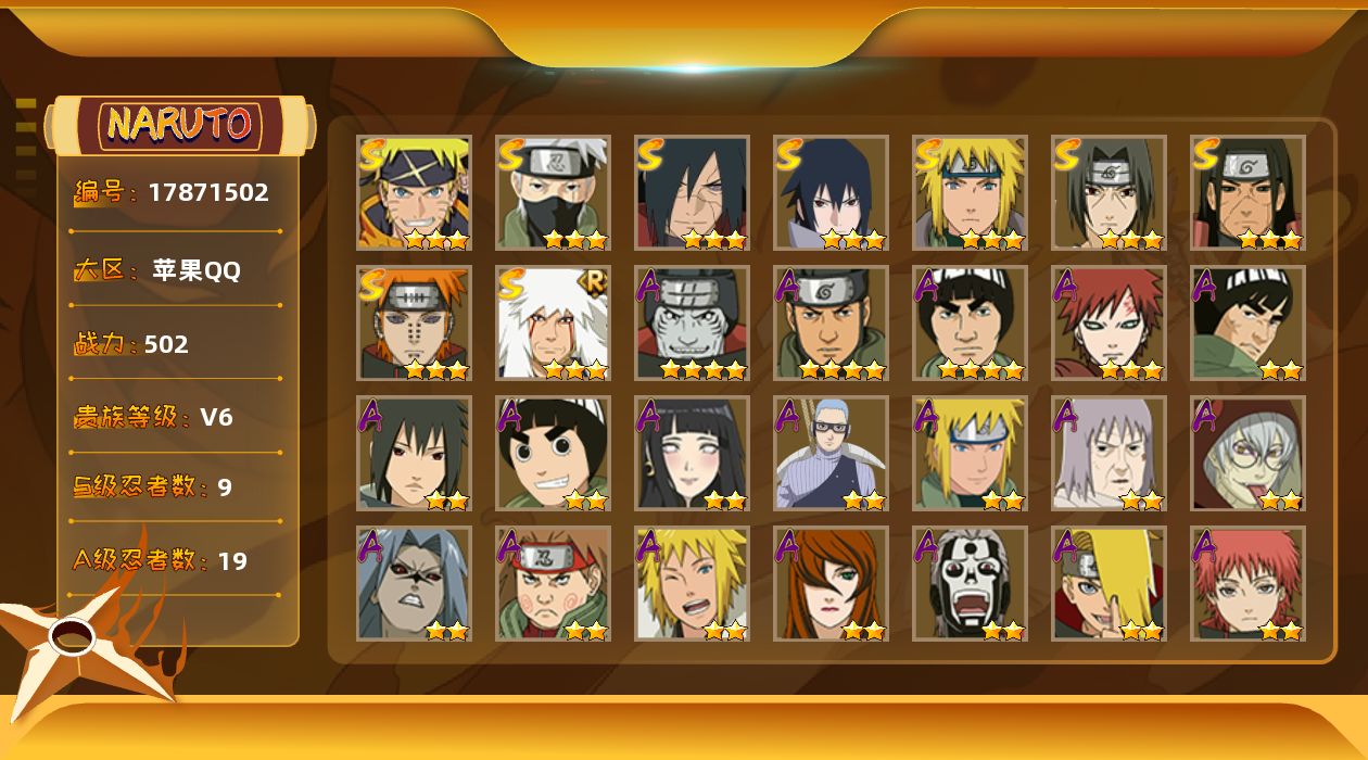 【S级忍者】:千手柱间「秽土转生」(3星),宇智波斑「秽土转生·解」(3星),宇智波鼬「须佐能乎」(3星),旗木卡卡西「须佐能乎」(3星),自来也「舞之豪杰」(3星),波风水门(3星),佩恩「天道」(3星),宇智波佐助「永恒万花筒」(3星),漩涡鸣人·宇智波佐助(3星)