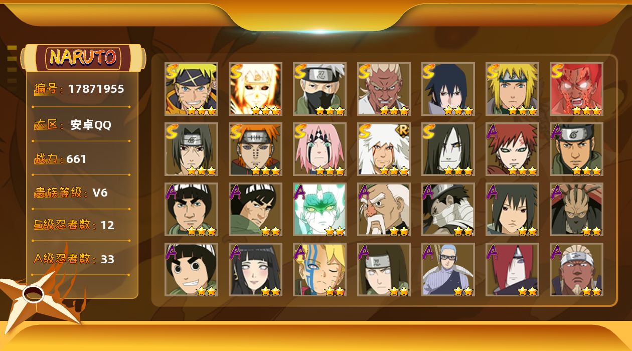 [17871955]12S级忍者数-33A级忍者数 【S级忍者】:春野樱「忍界大战」(3星),艾「忍界大战」(3星),宇智波鼬「须佐能乎」(3星),旗木卡卡西「须佐能乎」(3星),自来也「舞之豪杰」(3星),大蛇丸(3星),波风水门(3星),迈特凯「死门」(3星),佩恩「天道」(3星),宇智波佐助「永恒万花筒」(3星),波风水门「九喇嘛连结」(3星),漩涡鸣人·宇智波佐助(3星) 【A级忍者】:艾「青年」(2星),长门「青年」(2星),波风水门「青年」(2星),达鲁伊「博人传」(2星),迪达拉(2星),奇拉比(2星),飞段(2星),飞段「死司凭血」(2星),干柿鬼鲛(2星),漩涡博人「桃式显现」(2星),漩涡鸣人「九尾查克拉」(2星),迈特凯(3星),旗木卡卡西「万花筒写轮眼」(2星),桃地再不斩「漂泊武士」(2星),桃地再不斩「秽土转生」(2星),我爱罗「疾风传」(3星),蝎(2星),蝎「绯流琥」(2星),小南「神驹佑将」(2星),猿飞阿斯玛(3星),宇智波鼬(2星),日向宁次「忍界大战」(2星),日向雏田「最终章」(2星),长十郎「六代目水影」(2星),卑留呼「火之意志继承者」(2星),李洛克「忍界大战」(2星),猿飞木叶丸「博人传」(2星),秋道丁次「忍界大战」(2星),千代「近松十人卫」(2星),宇智波泉奈(2星),大野木「侠隐江湖」(2星),巳月「仙人模式」(2星),迈特凯「青春爆炸」(2星)