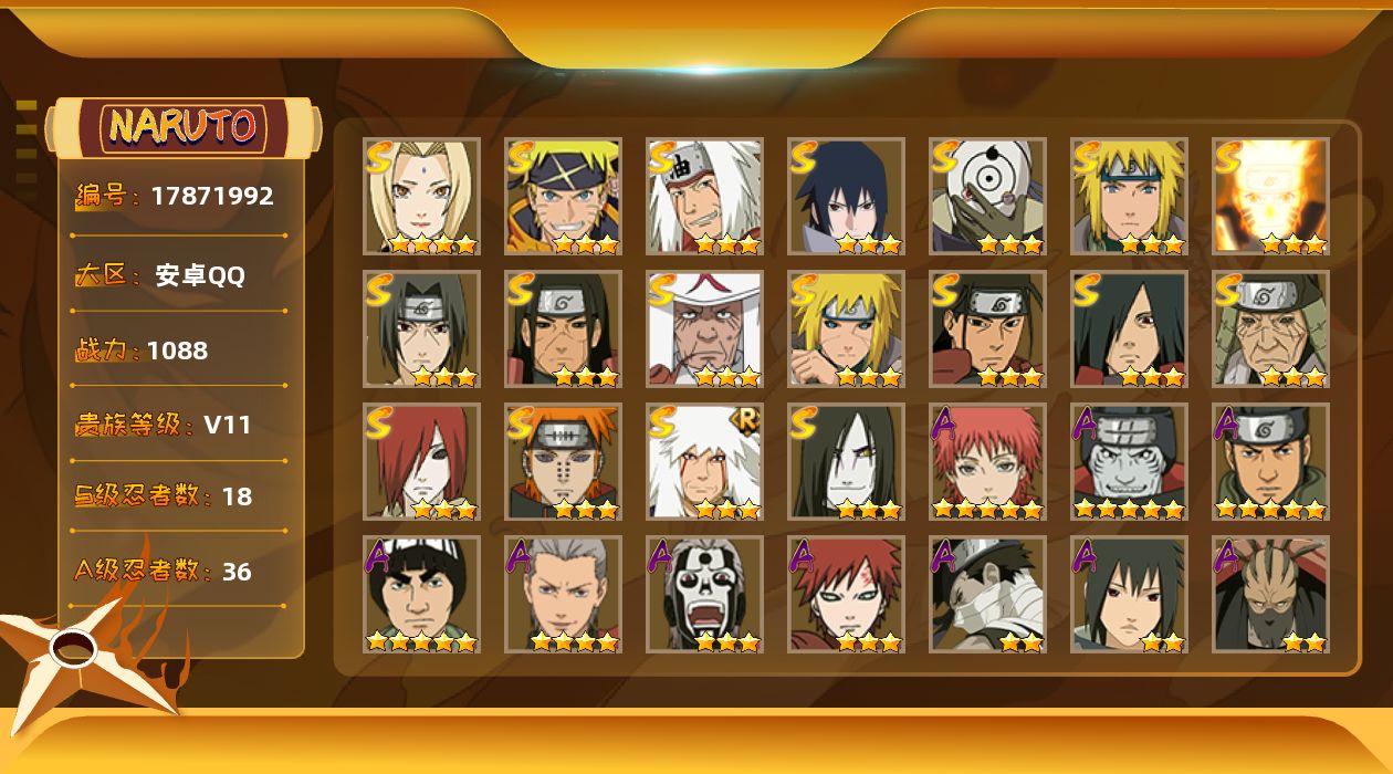 【A级忍者】:长门「青年」(2星),波风水门「青年」(2星),达鲁伊「博人传」(2星),迪达拉(2星),迪达拉「秽土转生」(2星),大蛇丸「晓」(2星),奇拉比(2星),飞段(4星),飞段「死司凭血」(3星),干柿鬼鲛(5星),漩涡鸣人「仙人模式」(2星),漩涡鸣人「九尾查克拉」(2星),迈特凯(5星),桃地再不斩「秽土转生」(2星),我爱罗「疾风传」(3星),我爱罗「忍界大战」(2星),蝎(5星),蝎「绯流琥」(2星),小南「夏日泳装」(2星),角都「地怨虞」(2星),猿飞阿斯玛(5星),宇智波止水(2星),宇智波鼬(2星),宇智波鼬「新春限定」(2星),宇智波佐助「须佐能乎」(2星),宇智波佐助「万花筒写轮眼」(2星),药师兜「半蛇斗篷」(2星),照美冥「五代目水影」(2星),宇智波带土「暴怒」(2星),长十郎「六代目水影」(2星),猿飞木叶丸「博人传」(2星),黑土「博人传」(2星),春野樱「百豪」(2星),秋道丁次「忍界大战」(2星),千代「近松十人卫」(2星),宇智波泉奈(2星)
