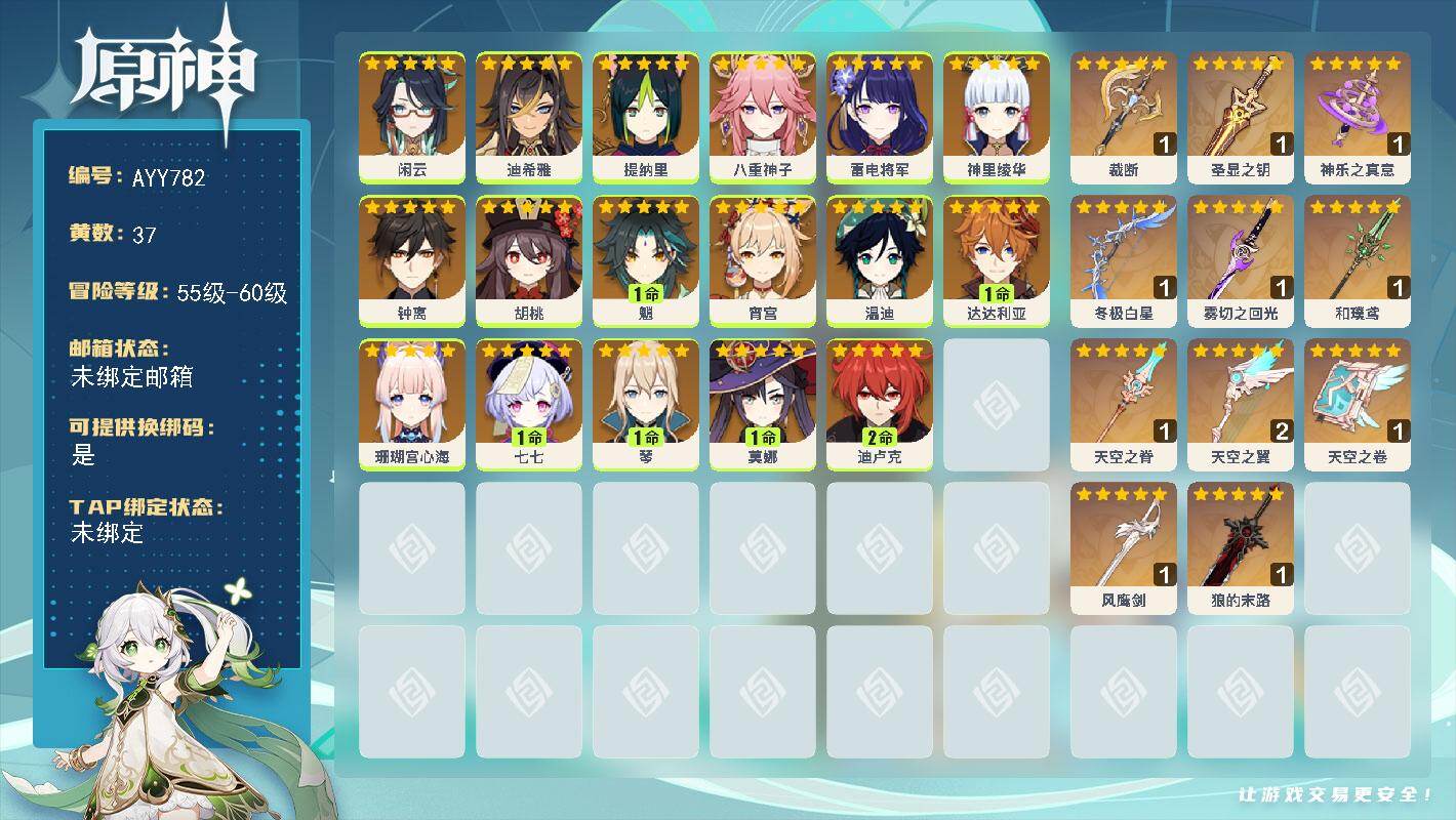 [17874225]60级/37黄/男主/17个五星角色/12个五星武器 0命闲云,0命迪希雅,0命提纳里,0命八重神子,0命雷电将军,0命神里绫华,0命钟离,0命胡桃,1命魈,0命宵宫,0命温迪,1命达达利亚,0命珊瑚宫心海,1命七七,1命琴,1命莫娜,2命迪卢克,精1裁断,精1圣显之钥,精1神乐之真意,精1冬极白星,精1雾切之回光,精1和璞鸢,精1天空之脊,精2天空之翼,精1天空之卷,精1风鹰剑,精1狼的末路