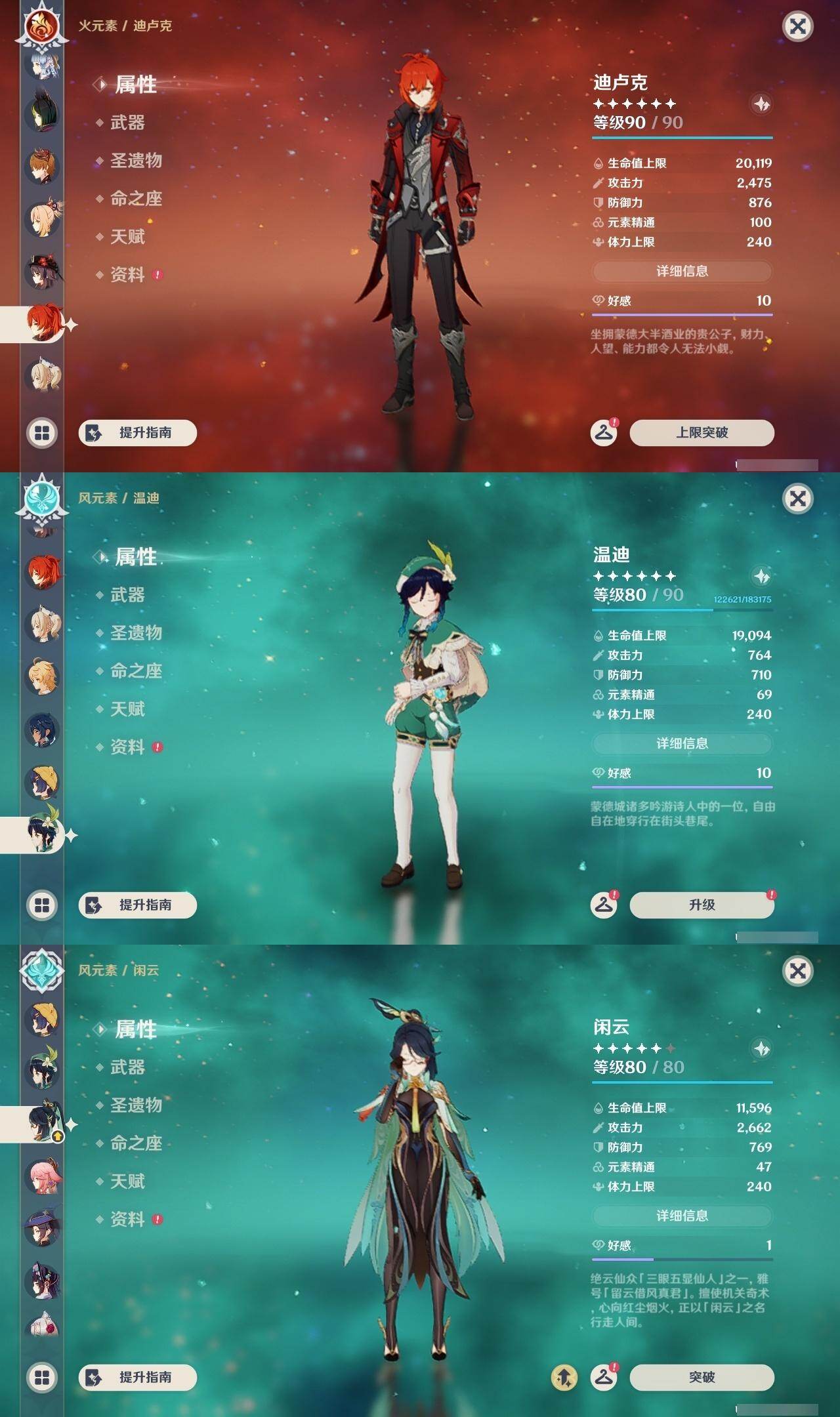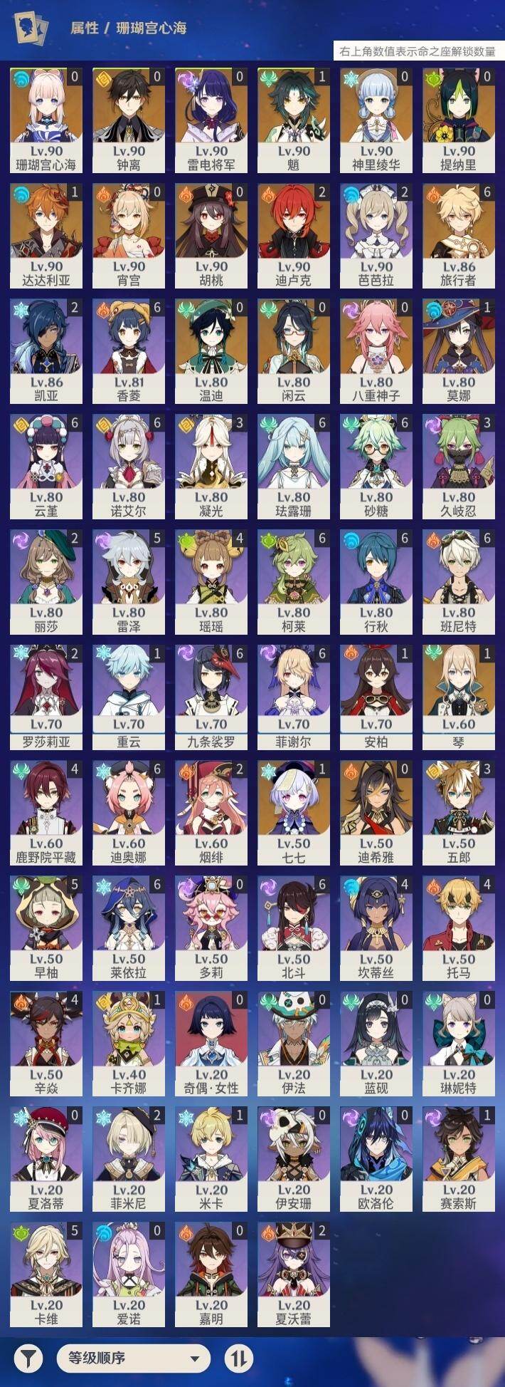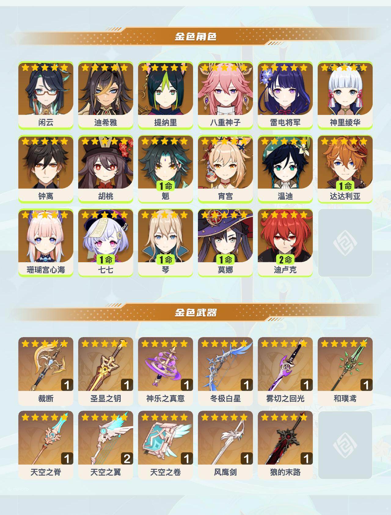 0命闲云,0命迪希雅,0命提纳里,0命八重神子,0命雷电将军,0命神里绫华,0命钟离,0命胡桃,1命魈,0命宵宫,0命温迪,1命达达利亚,0命珊瑚宫心海,1命七七,1命琴,1命莫娜,2命迪卢克,精1裁断,精1圣显之钥,精1神乐之真意,精1冬极白星,精1雾切之回光,精1和璞鸢,精1天空之脊,精2天空之翼,精1天空之卷,精1风鹰剑,精1狼的末路