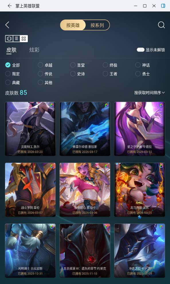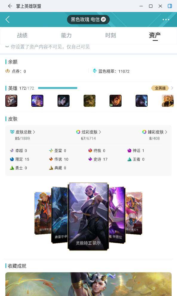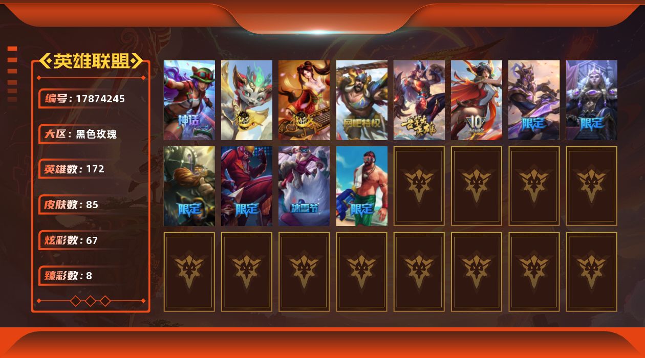 [17874245]未定级段位-172英雄-85皮肤-67炫彩-0终极-1神话-15限定-10传说-17史诗