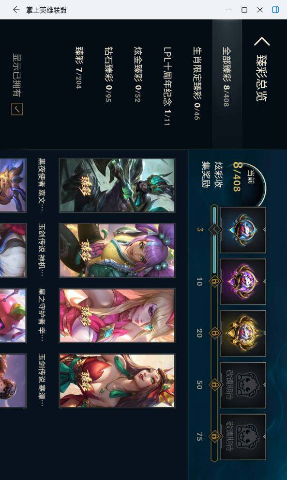 【臻彩皮肤】:无畏骑士瑟庄妮赤子初心,咖啡甜心璐璐焦糖布丁,星之守护者辛德拉未来之光,幻灵战斗兔锐雯梦幻强袭,玉剑传说寒潭夭夭胭脂,玉剑传说神机花火青竹,可爱可爱粉红红布里茨,黑夜使者嘉文四世白夜