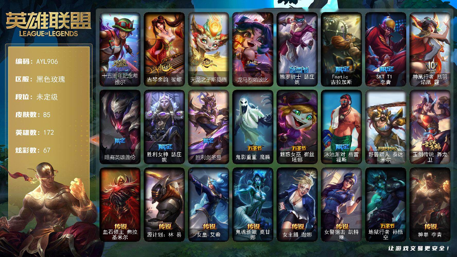 [17874245]未定级段位-172英雄-85皮肤-67炫彩-0终极-1神话-15限定-10传说-17史诗 【热门头像】:爱情之歌头像,觅心游侠卢锡安头像 【神话皮肤】:十五周年纪念希维尔 【臻彩皮肤】:无畏骑士瑟庄妮赤子初心,咖啡甜心璐璐焦糖布丁,星之守护者辛德拉未来之光,幻灵战斗兔锐雯梦幻强袭,玉剑传说寒潭夭夭胭脂,玉剑传说神机花火青竹,可爱可爱粉红红布里茨,黑夜使者嘉文四世白夜 【年限皮肤】:古琴余韵娑娜,天龙之子斯莫德,龙马烈焰波比 【冰雪限定】:魄罗骑士瑟庄妮 【限定皮肤】:Fnatic古拉加斯,SKTT1李青,神凰行者烈羽焰凰霞,暗裔英雄盖伦,胜利女神瑟庄妮,胜利剑圣易,鬼影重重魔腾,魅惑女巫崔丝塔娜,泳池派对格雷福斯,野兽猎人泰达米尔,玉剑传说舞龙卫 【传说皮肤】:血石领主弗拉基米尔,源计划林易,女皇艾希,鬼魂新娘莫甘娜,女主播迦娜,女警狙击凯特琳,地狱行者孙悟空,神拳李青,银河魔装机神兰博,黑夜使者亚索 【史诗皮肤】:摄魂男爵弗拉基米尔,地狱火阿利斯塔,钢铁之心希维尔,黑帮狂花厄运小姐,龙骑统帅嘉文四世,暗星嘉文四世,死亡绽放伊莉丝,灵骨工匠奥莉安娜,冰晶之核布兰德,至高之拳李青,腥红之月泰隆,星际迷航拉克丝,骸骨之爪希瓦娜,皇家守卫菲奥娜,生化骑士德莱厄斯,炼狱魔女蔚,霸天剑魔亚托克斯 【其他皮肤】:逆转裁判崔斯特,幻执事乐芙兰,灵能特工凯尔,美国大叔瑞兹,咖啡甜心索拉卡,梦魇泰达米尔,光明骑士贾克斯,五杀摇滚III遗失的章节卡尔萨斯,绝息圣堂科加斯,冲击之刃卡萨丁,银白枪骑布里茨,古神墨菲特,黑色玫瑰假面舞会伊莉丝,战斗学院孙悟空,永恒之森孙悟空,神龙尊者魔龙布兰德,上古魔蛇卡西奥佩娅,光明骑士古拉加斯,失落的世界伊泽瑞尔,五杀摇滚III遗失的章节约里克,德玛西亚警官盖伦,战斗学院盖伦,战斗学院蕾欧娜,西部魔影猎天使恶魔泰隆,荣誉使者慎,兔宝宝菲兹,瑟庄妮逐晓者,刃执事德莱文,车骑之力赫卡里姆,黑潮黛安娜,星之守护者辛德拉,净雪之月凯隐,腥红之月婕拉,荣誉使者阿克尚,双城之战金克丝,国王佛耶戈,月蚀骑士亚托克斯,绝息圣堂洛,弗雷尔卓德塞拉斯,光明哨兵派克,墨之影武者永恩,太空律动百万调音格温
