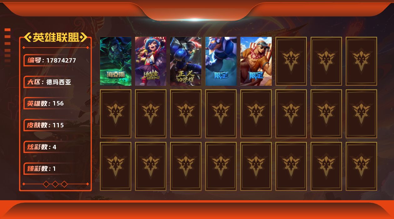 [17874277]黄金段位-156英雄-115皮肤-4炫彩-0终极-3神话-6限定-12传说-27史诗
