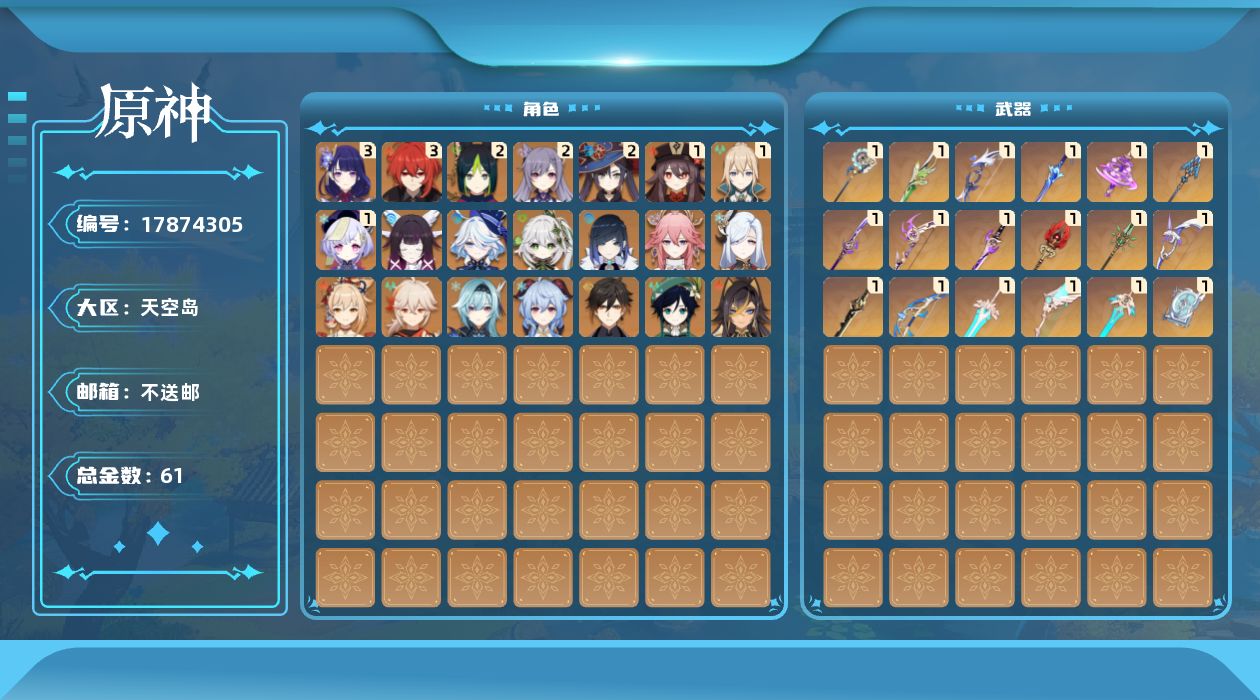 0命芙宁娜,0命迪希雅,0命纳西妲,2命提纳里,0命夜兰,0命八重神子,0命申鹤,0命优菈,3命雷电将军,0命枫原万叶,0命钟离,1命胡桃,0命甘雨,0命宵宫,0命温迪,2命刻晴,1命七七,1命琴,2命莫娜,3命迪卢克,0命哥伦比娅,精1裁叶萃光,精1若水,精1波乱月白经津,精1神乐之真意,精1息灾,精1终末嗟叹之诗,精1薙草之稻光,精1飞雷之弦振,精1雾切之回光,精1护摩之杖,精1四风原典,精1和璞鸢,精1天空之翼,精1阿莫斯之弓,精1天空之刃,精1斫峰之刃,精1天空之傲,精1支离轮光