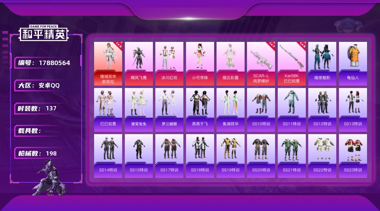 [17880564]【特价出售/店主推荐】 安卓 手Q-1神装-4粉装-4特效枪-0载具-2粉色飞行器-58994热力值-8王牌印记-137套装-198枪皮【红色神装等级】:镜域双华-欧若拉(三级)【红色角色神装】:镜域双华-欧若拉【热门品类】:套装-龟仙人【粉色套装】:粉装-飓风飞鹰,粉装-冰川红玫,角色-小可学妹,角色-烟云彩露【粉色枪皮等级】:SCAR-L-纯梦嫁纱(七级),Kar98K-巳巳如意(四级),Mk14-福马献瑞(五级),AA12-G-萌骑幻想(二级)【粉色枪皮】:SCAR-L-纯梦嫁纱,Kar98K-巳巳如意,Mk14-福马献瑞,AA12-G-萌骑幻想