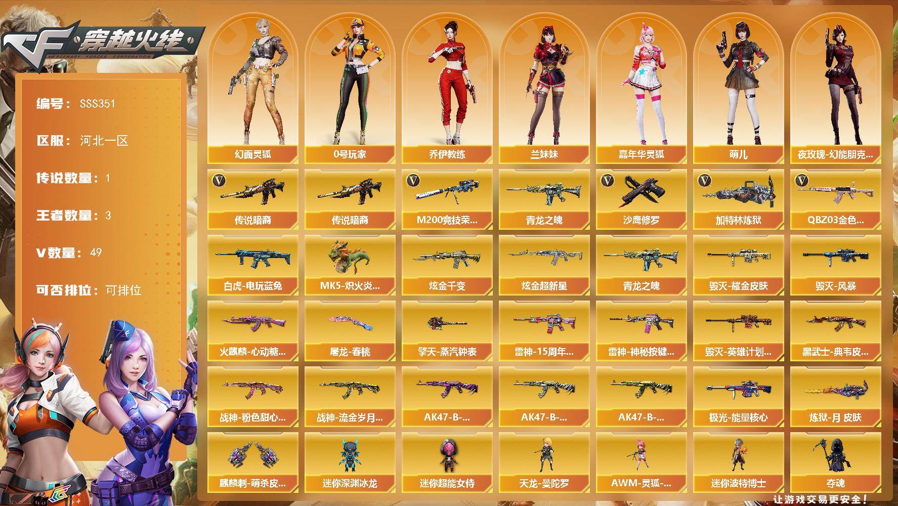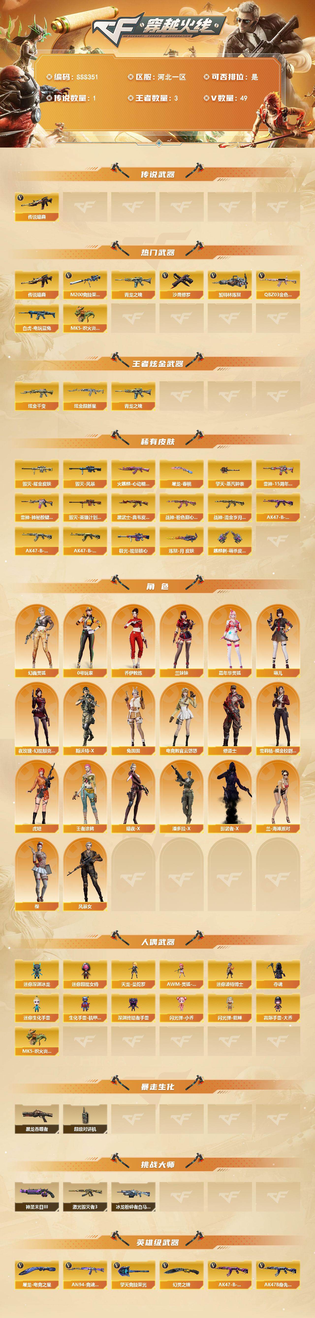 [17882132]河北一区-52V-3王者武器数-2炫金武器数 【传说武器】:传说暗裔 【热门武器】:传说暗裔,QBZ03-金色蔷薇,M200-竞技荣光,青龙之魄,白虎-电玩蓝兔,加特林-炼狱,MK5-炽火炎龙,沙鹰-修罗 【王者炫金武器】:青龙之魄,炫金千变,炫金超新星 【皮肤】:雷神-15周年嘉年华 皮肤,雷神-神秘按键 皮肤,火麒麟-心动糖果,毁灭耀金皮肤,毁灭-风暴,毁灭-英雄计划 皮肤,黑武士-典韦皮肤,战神-粉色甜心皮肤,战神-流金岁月皮肤,AK47-B-常胜将军-曹操,AK47-B-常胜将军-刘备,AK47-B-常胜将军-孙权,极光-能量核心,炼狱-月 皮肤,屠龙-春桃 皮肤*2,擎天-蒸汽钟表 皮肤,麒麟刺-萌杀皮肤 【角色】:樱,电竞教官-云悠悠,王者涂鸦,乔伊教练,修道士,幻面灵狐,暗夜-X,风暴女*2,虎妞,嘉年华灵狐,兰-海滩派对,兰妹妹,0号玩家,萌儿,潘多拉-X,斯沃特-X,兔囡囡,雪莉杨-摸金校尉,夜玫瑰-幻能朋克,影武者-X 【人偶武器】:天龙-曼陀罗,MK5-炽火炎龙,AWM-灵狐-15周年嘉年华,迷你深渊冰龙,迷你波特博士,夺魂,迷你生化手雷,生化手雷-机甲核心*2,深渊终结者手雷,闪光弹-小乔,闪光弹-貂蝉,高爆手雷-大乔,迷你超能女侍 【暴走生化】:黑龙吞噬者,超级对讲机 【挑战大师】:冰龙粉碎者-白马银枪,激光毁灭者III,神圣爆裂者-末日III 【英雄级武器】:AK47-火麒麟,M4A1-雷神,AK47-黑武士,无影-神兵利器,QBZ03-金色蔷薇,9A91-烈火,王者之魄-觉醒版,AK-47-猩红传说*3,黑骑士-海王,AK47-B-常胜将军,白虎-电玩蓝兔,HK417-朱雀-电竞之星,AK47-B-身先士卒,AK47-B-战士,Barrett-毁灭,Barrett-极光,Barrett-朱雀,M200-竞技荣光,Barrett-暗月传说,加特林-炼狱,沙鹰-修罗,沙鹰-天神,柯尔特-电竞装甲,屠龙,擎天,麒麟刺,幻灵之锋,擎天-竞技荣光,王者之击-觉醒版,屠龙-电竞之星,高爆手雷-幻灵*2,高爆手雷-竞技荣光,高爆手雷-云龙,闪光弹-幻灵,闪光弹-竞技荣光*2,闪光弹-云龙,烟雾弹-幻灵,烟雾弹-竞技荣光*2,烟雾弹-云龙,AN94-竞魂超新星 【源级武器】:源-千变,源·火麒麟,魂·火麒麟-百城,御·火麒麟-平天大圣,源-黑龙,御·