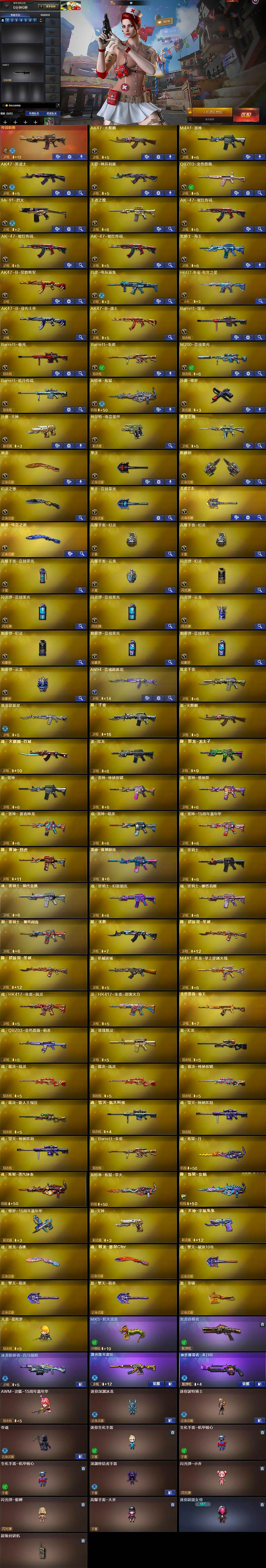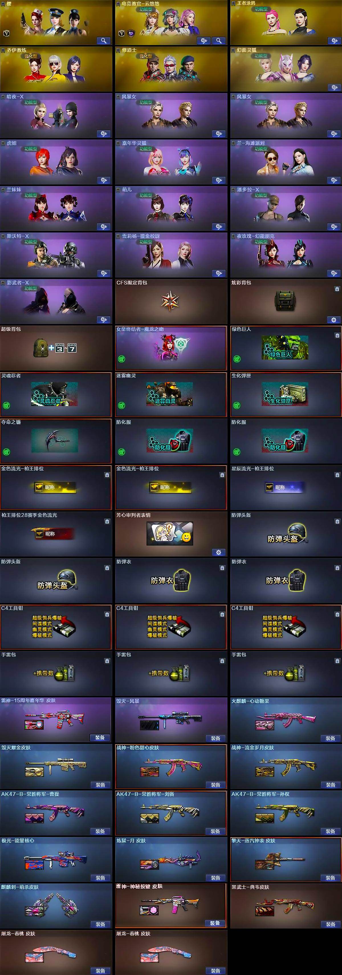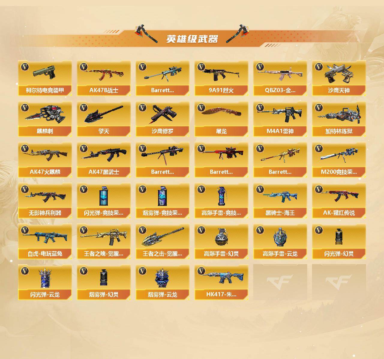 【英雄级武器】:AK47-火麒麟,M4A1-雷神,AK47-黑武士,无影-神兵利器,QBZ03-金色蔷薇,9A91-烈火,王者之魄-觉醒版,AK-47-猩红传说*3,黑骑士-海王,AK47-B-常胜将军,白虎-电玩蓝兔,HK417-朱雀-电竞之星,AK47-B-身先士卒,AK47-B-战士,Barrett-毁灭,Barrett-极光,Barrett-朱雀,M200-竞技荣光,Barrett-暗月传说,加特林-炼狱,沙鹰-修罗,沙鹰-天神,柯尔特-电竞装甲,屠龙,擎天,麒麟刺,幻灵之锋,擎天-竞技荣光,王者之击-觉醒版,屠龙-电竞之星,高爆手雷-幻灵*2,高爆手雷-竞技荣光,高爆手雷-云龙,闪光弹-幻灵,闪光弹-竞技荣光*2,闪光弹-云龙,烟雾弹-幻灵,烟雾弹-竞技荣光*2,烟雾弹-云龙,AN94-竞魂超新星