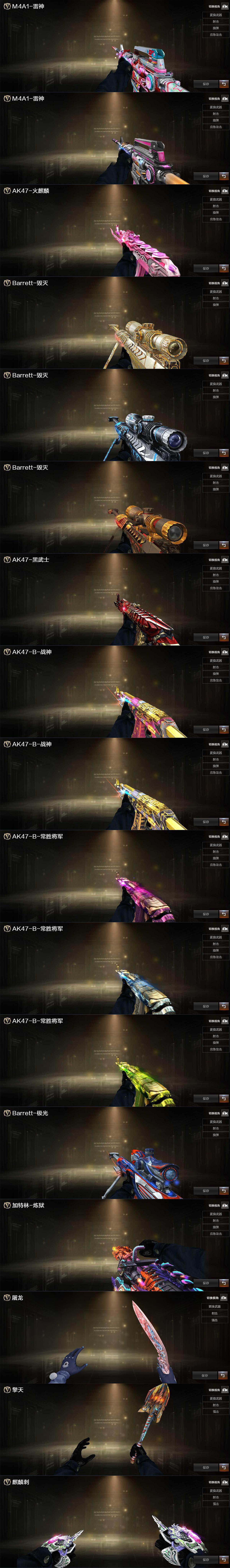 【皮肤】:雷神-15周年嘉年华 皮肤,雷神-神秘按键 皮肤,火麒麟-心动糖果,毁灭耀金皮肤,毁灭-风暴,毁灭-英雄计划 皮肤,黑武士-典韦皮肤,战神-粉色甜心皮肤,战神-流金岁月皮肤,AK47-B-常胜将军-曹操,AK47-B-常胜将军-刘备,AK47-B-常胜将军-孙权,极光-能量核心,炼狱-月 皮肤,屠龙-春桃 皮肤*2,擎天-蒸汽钟表 皮肤,麒麟刺-萌杀皮肤