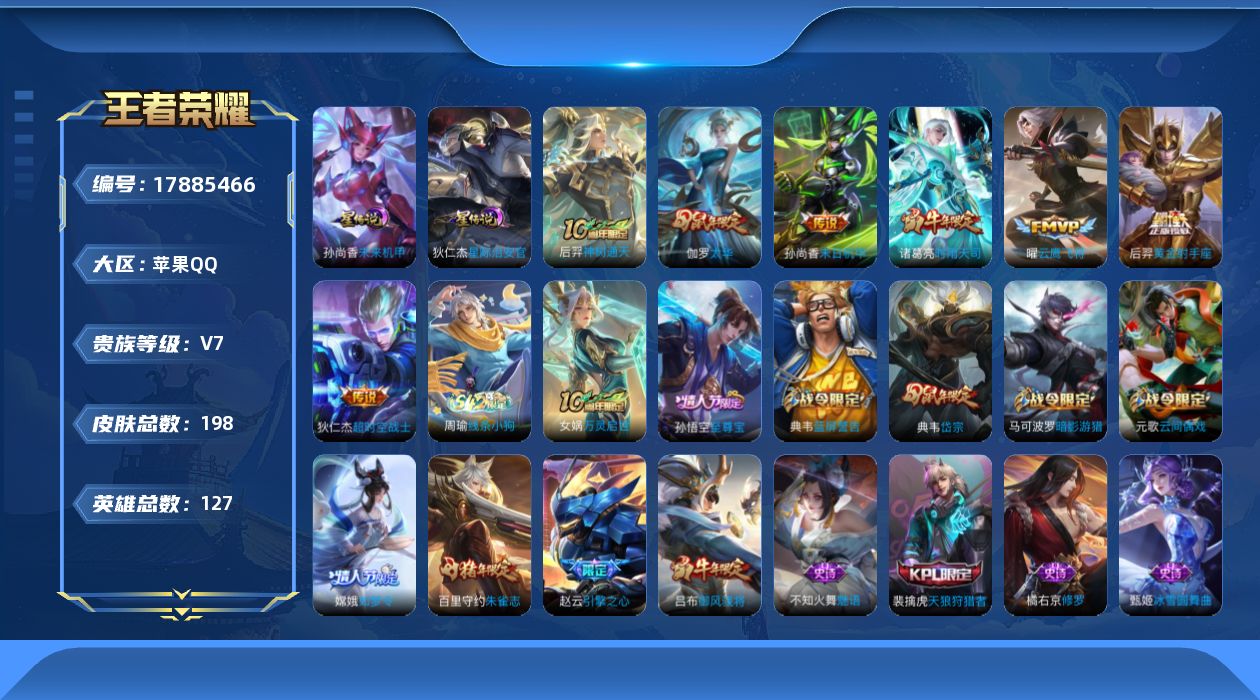 [17885466]可二次【特价出售/店主推荐】:苹果Q-V7-至尊星耀I段位-127英雄-198皮肤-7传说-2星元-54史诗