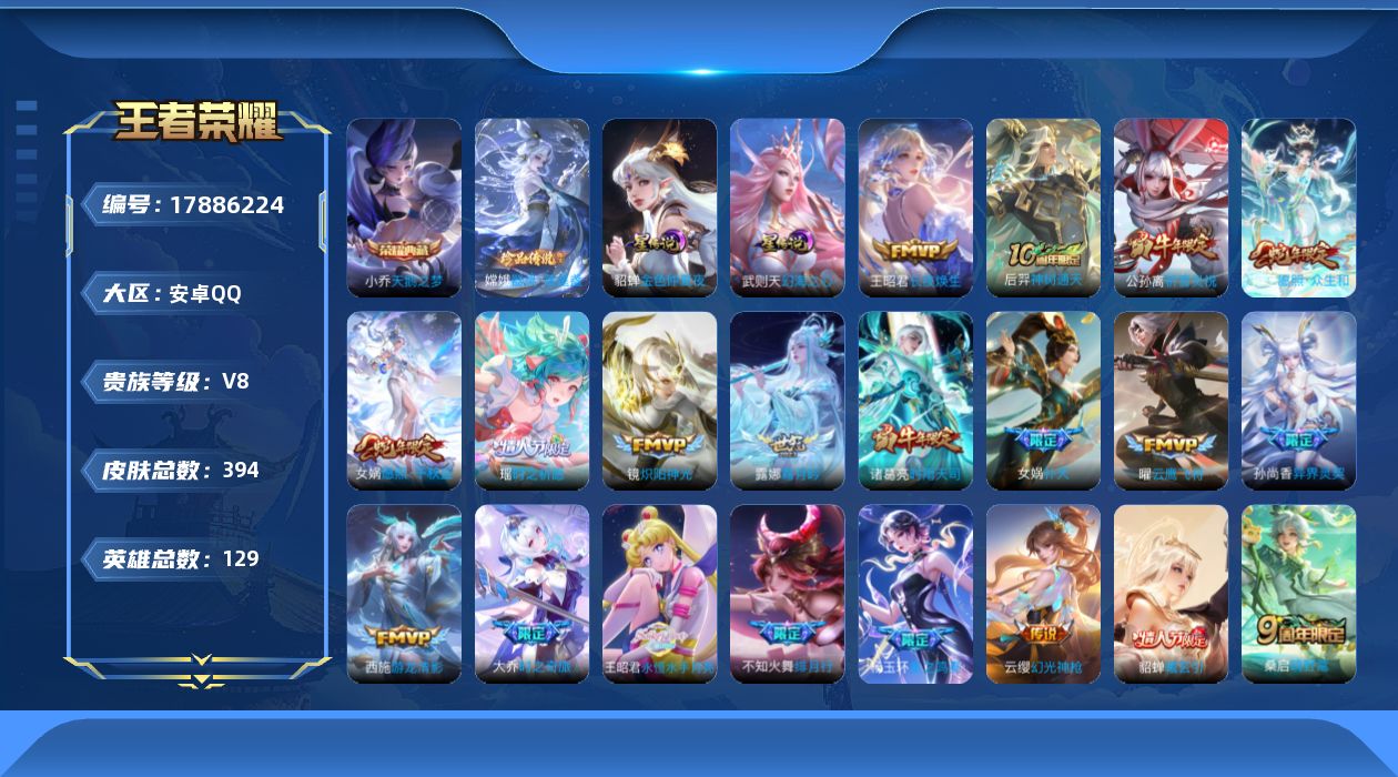 [17886224]【特价急出/详情看图】安卓Q-V8-最强王者段位-129英雄-394皮肤-1典藏皮肤-1典藏英雄-1珍品传说-2星元-34传说-128史诗