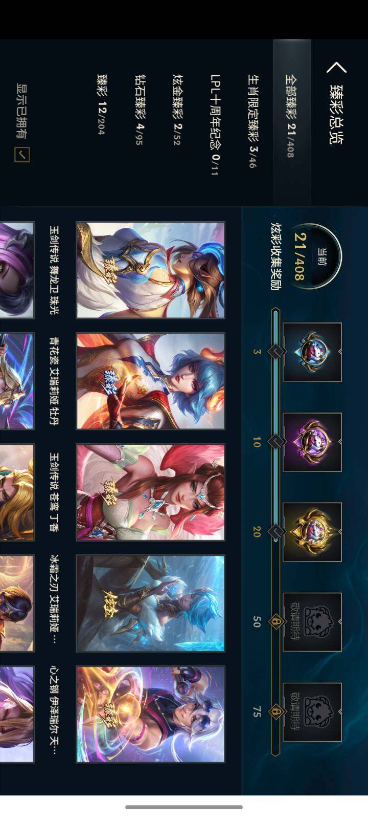 【臻彩皮肤】:龙的传人李青龙啸九天,银龙裁决泰隆潜龙在渊,天龙之子卡莎飞龙乘云,冰霜之刃艾瑞莉娅炫金,墨之影武者亚索金墨耀影,觅心萝莉金克丝是心动啊,花仙子拉克丝纹白,青花瓷艾瑞莉娅月色,玉剑传说神机花火青竹,玉剑传说苍鸾丁香,灵魂莲华亚索霜见之时,海之歌永恩月夜潮汐,魔女阿卡丽虚荣,魔女阿狸饕餮,净雪之月莫甘娜冬虹,心之钢伊泽瑞尔锐意曲风,黑夜使者嘉文四世白夜,暗影妖狐阿狸入梦之影,心之钢伊泽瑞尔天纵才华