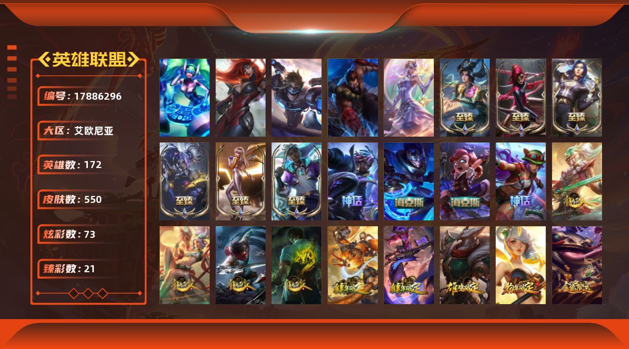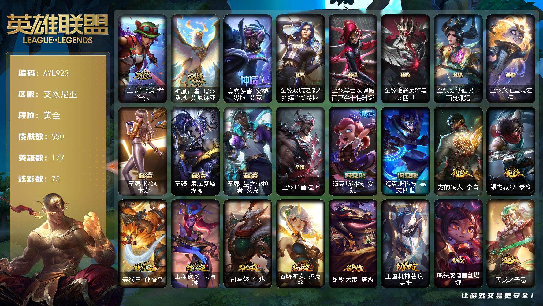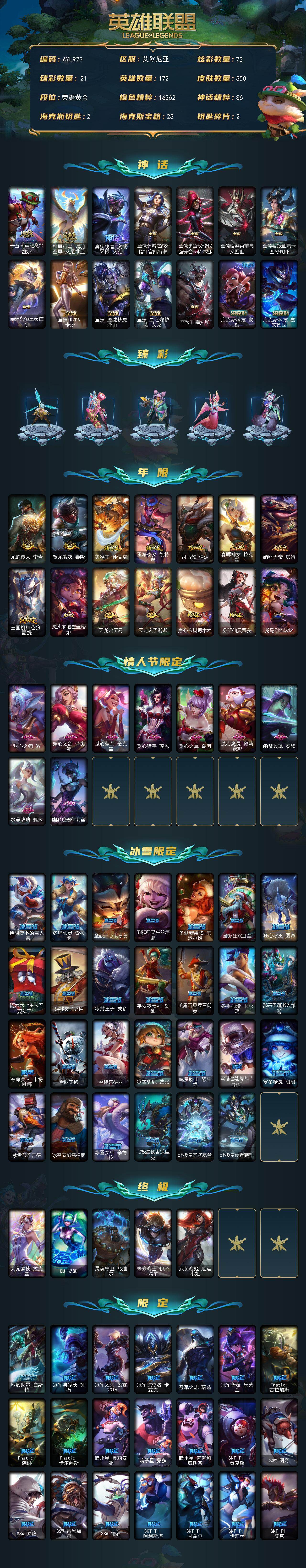 [17886296]【店主推荐捡漏号】黄金段位-172英雄-550皮肤-73炫彩-5终极-14神话-145限定-45传说-29史诗 【神话皮肤】:十五周年纪念希维尔,神凰行者瑞羽圣凰艾尼维亚,真实伤害突破界限艾克 【至臻皮肤】:至臻双城之战2指挥官凯特琳,至臻黑色玫瑰假面舞会卡特琳娜,至臻暗裔英雄嘉文四世,至臻剪纸仙灵卡西奥佩娅,至臻永恒星灵佐伊,至臻KDA卡莎,至臻魔域梦魇泽丽,至臻星之守护者艾克,至臻T1塞拉斯 【海克斯皮肤】:海克斯科技安妮,海克斯科技嘉文四世 【臻彩皮肤】:龙的传人李青龙啸九天,银龙裁决泰隆潜龙在渊,天龙之子卡莎飞龙乘云,冰霜之刃艾瑞莉娅炫金,墨之影武者亚索金墨耀影,觅心萝莉金克丝是心动啊,花仙子拉克丝纹白,青花瓷艾瑞莉娅月色,玉剑传说神机花火青竹,玉剑传说苍鸾丁香,灵魂莲华亚索霜见之时,海之歌永恩月夜潮汐,魔女阿卡丽虚荣,魔女阿狸饕餮,净雪之月莫甘娜冬虹,心之钢伊泽瑞尔锐意曲风,黑夜使者嘉文四世白夜,暗影妖狐阿狸入梦之影,心之钢伊泽瑞尔天纵才华 【年限皮肤】:龙的传人李青,银龙裁决泰隆,美猴王孙悟空,玉净夜叉凯特琳,司马懿仲达,春晖神女拉克丝,纳财大帝塔姆,王国机神苍狼瑟提,虎头虎脑崔丝塔娜,天龙之子易,天龙之子迦娜,点心宝贝阿木木,剪纸仙灵娜美,龙马烈焰波比 【情人节限定】:甜心之翎洛,穿心之剑菲奥娜,觅心萝莉金克丝,觅心猎手薇恩,觅心之翼奎因,觅心魔灵奥莉安娜,幽梦玫瑰泰隆,水晶玫瑰婕拉,幽梦玫瑰伊莉丝 【冰雪限定】:持胡萝卜的雪人易,冬境仙灵索拉卡,圣诞开心鬼提莫,圣诞精灵崔丝塔娜,圣诞糖果棒厄运小姐,圣诞狂欢基兰,狂心冰王图奇,阿木木“主人不要我了”,胡桃夹子萨科,冰封王子蒙多,平安夜女神娑娜,英勇玩具兵普朗克,冬季仙境卡尔玛,邪恶圣诞老人维迦,夺命美人卡特琳娜,雪默丁格,雪装奈德丽,冰雪驯鹿波比,魄罗骑士瑟庄妮,雪球也能爆炸吉格斯,寒冬精灵璐璐,冰雪节辛吉德,冰雪节格雷福斯,冰雪女神辛德拉,北极星使者沃里克,北极星圣贤基兰,北极星使者萨科 【终极皮肤】:大元素使拉克丝,DJ娑娜,灵魂守卫乌迪尔,未来战士伊泽瑞尔,武装战姬厄运小姐 【限定皮肤】:地底世界崔斯特,冠军典狱长锤石,冠军之刃锐雯2016,冠军掠夺者卡兹克,冠军之志瑞兹,冠军蔷薇乐芙兰,Fnatic古拉加斯,Fnatic迦娜,Fnatic卡尔萨斯,暗杀星奥莉安娜,暗杀星蒙多,暗杀星努努和威朗