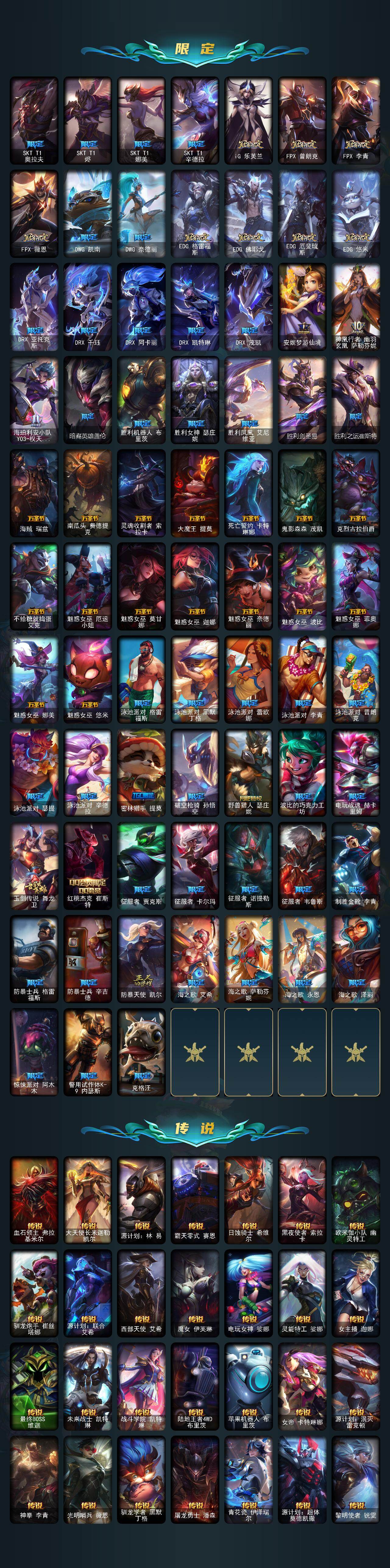 【年限皮肤】:龙的传人李青,银龙裁决泰隆,美猴王孙悟空,玉净夜叉凯特琳,司马懿仲达,春晖神女拉克丝,纳财大帝塔姆,王国机神苍狼瑟提,虎头虎脑崔丝塔娜,天龙之子易,天龙之子迦娜,点心宝贝阿木木,剪纸仙灵娜美,龙马烈焰波比