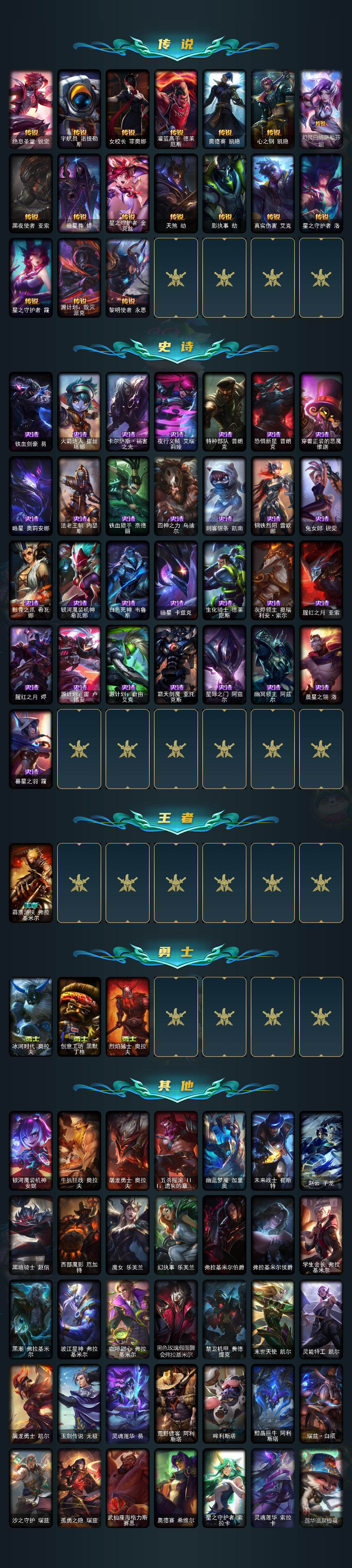 - PX_2081120-贵族等级: V8 英雄数: 123 皮肤数: 255 荣耀水晶: 鸣剑·曳影,全息碎影 传说皮: 云鹰飞将,澜逐花归海 限定皮: 冰锋战神,李小龙,梁祝,至尊宝,如梦令-后羿,高山流水,五谷丰年