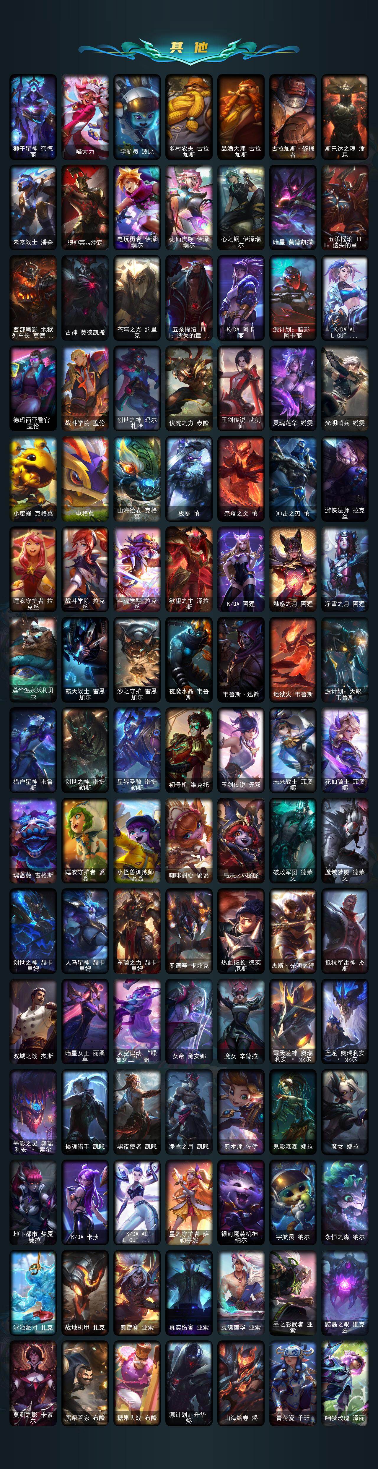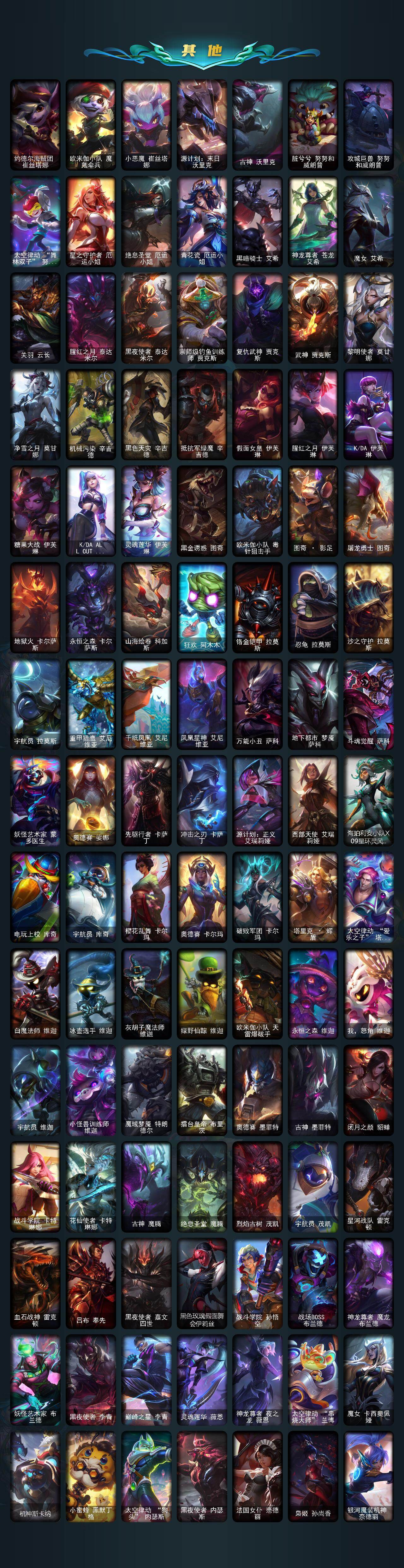 【冰雪限定】:持胡萝卜的雪人易,冬境仙灵索拉卡,圣诞开心鬼提莫,圣诞精灵崔丝塔娜,圣诞糖果棒厄运小姐,圣诞狂欢基兰,狂心冰王图奇,阿木木“主人不要我了”,胡桃夹子萨科,冰封王子蒙多,平安夜女神娑娜,英勇玩具兵普朗克,冬季仙境卡尔玛,邪恶圣诞老人维迦,夺命美人卡特琳娜,雪默丁格,雪装奈德丽,冰雪驯鹿波比,魄罗骑士瑟庄妮,雪球也能爆炸吉格斯,寒冬精灵璐璐,冰雪节辛吉德,冰雪节格雷福斯,冰雪女神辛德拉,北极星使者沃里克,北极星圣贤基兰,北极星使者萨科