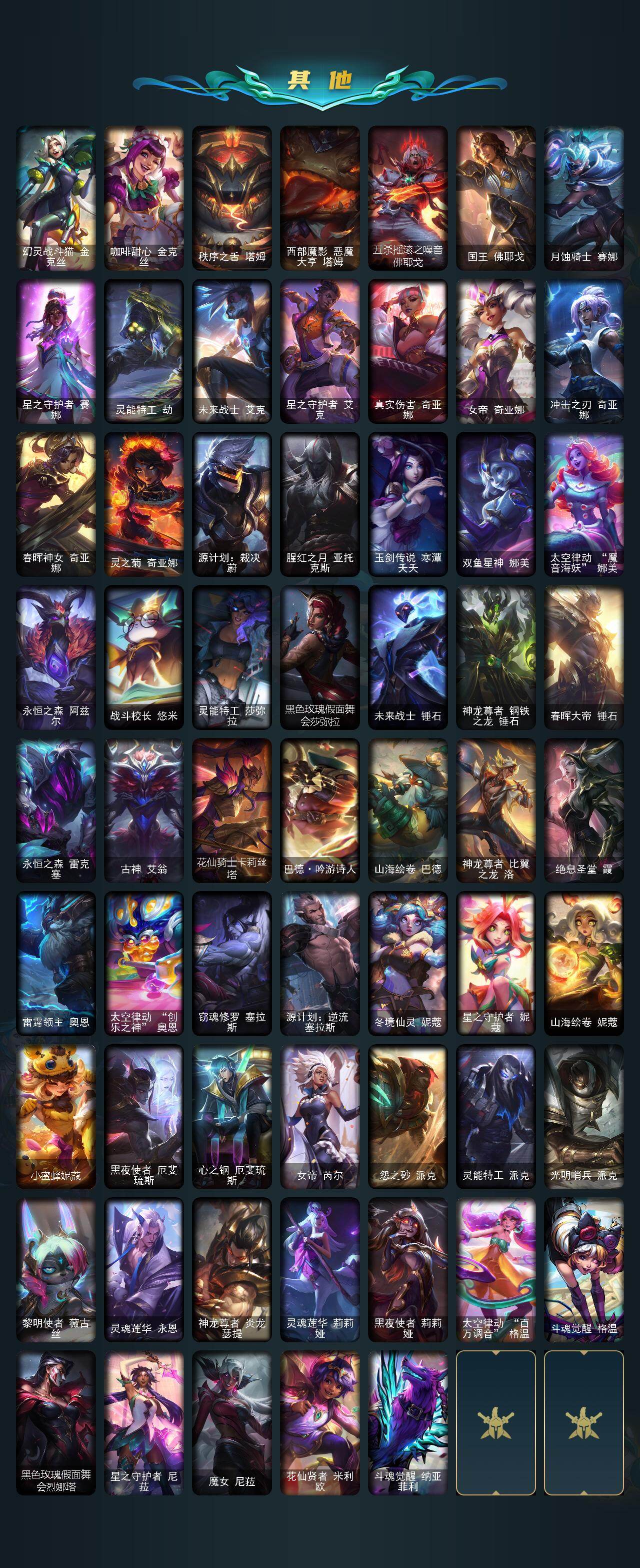 【至臻皮肤】:至臻双城之战2指挥官凯特琳,至臻黑色玫瑰假面舞会卡特琳娜,至臻暗裔英雄嘉文四世,至臻剪纸仙灵卡西奥佩娅,至臻永恒星灵佐伊,至臻KDA卡莎,至臻魔域梦魇泽丽,至臻星之守护者艾克,至臻T1塞拉斯
