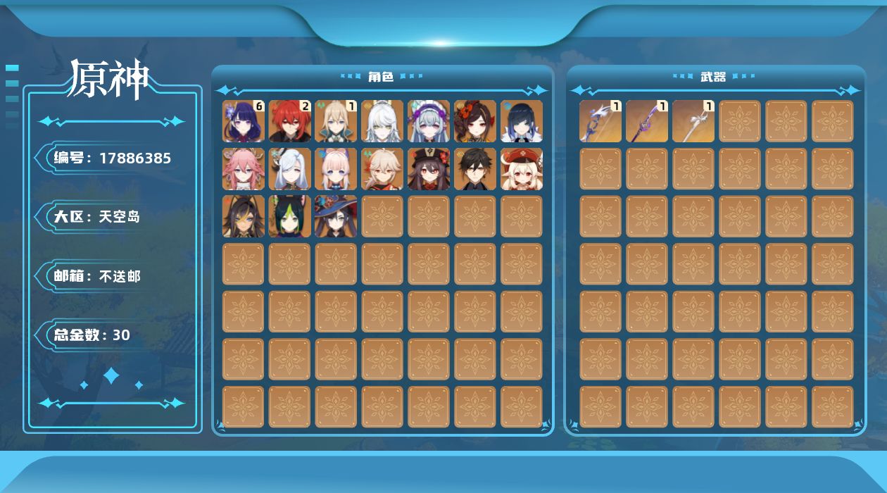 0命千织,0命迪希雅,0命提纳里,0命夜兰,0命八重神子,0命申鹤,满命雷电将军,0命枫原万叶,0命钟离,0命胡桃,0命可莉,0命珊瑚宫心海,1命琴,0命莫娜,2命迪卢克,0命梦见月瑞希,0命兹白,精1若水,精1薙草之稻光,精1风鹰剑