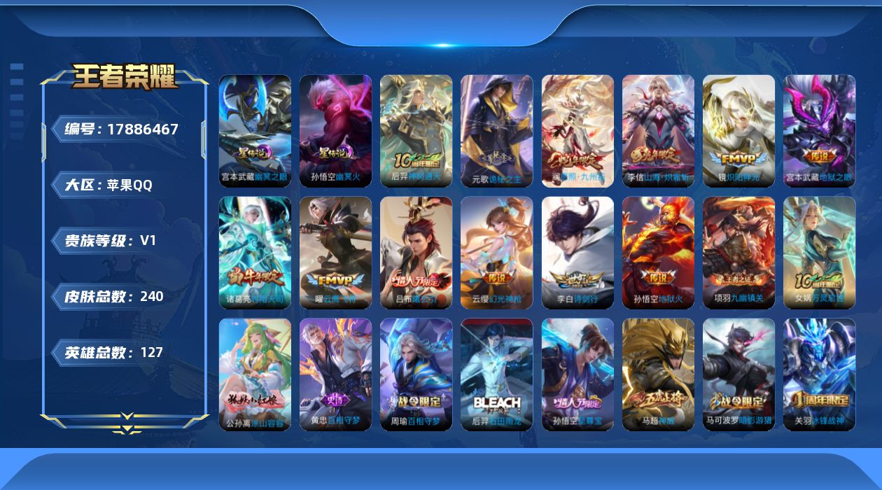 [17886467]【特价急出/详情看图】苹果Q-V1-永恒钻石III段位-127英雄-240皮肤-2星元-12传说-72史诗