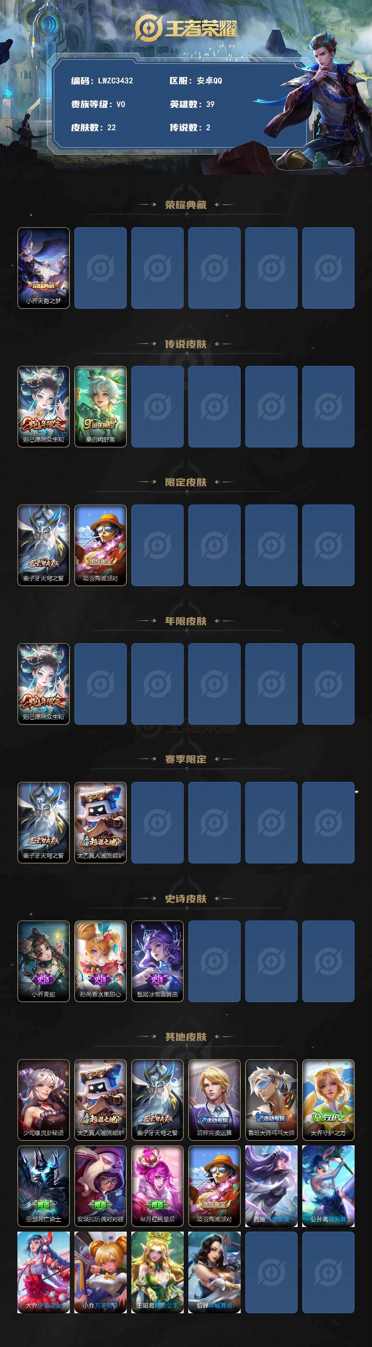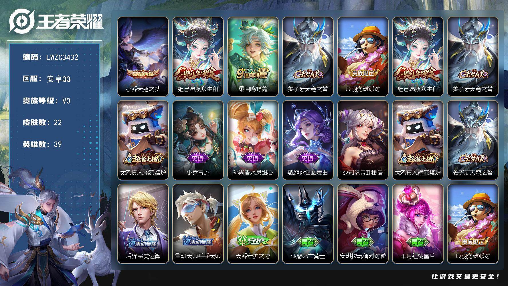[17886527]【特价急出/详情看图】安卓Q-V0-荣耀黄金II段位-39英雄-22皮肤-1典藏皮肤-2传说-3史诗