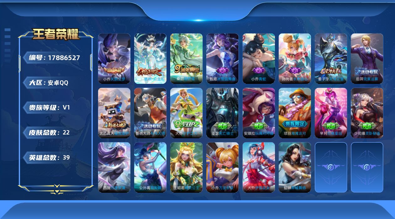 [17886527]【特价急出/详情看图】安卓Q-V0-荣耀黄金II段位-39英雄-22皮肤-1典藏皮肤-2传说-3史诗 【荣耀典藏】:小乔天鹅之梦 【传说皮肤】:妲己愿照众生和,桑启鸣野蒿 【限定皮肤】:姜子牙天穹之誓,项羽海滩派对 【年限皮肤】:妲己愿照众生和 【赛季限定】:姜子牙天穹之誓,太乙真人谧流熔炉 【史诗皮肤】:小乔青蛇,孙尚香水果甜心,甄姬冰雪圆舞曲 【其他皮肤】:少司缘灵卦秘语,太乙真人谧流熔炉,姜子牙天穹之誓,后羿完美运算,鲁班大师乓乓大师,大乔守护之力,亚瑟死亡骑士,安琪拉玩偶对对碰,芈月红桃皇后,项羽海滩派对,西施归虚梦演,公孙离花间舞,大乔伊势巫女,小乔万圣前夜,王昭君精灵公主,貂蝉异域舞娘 【营地ID】:1733658168