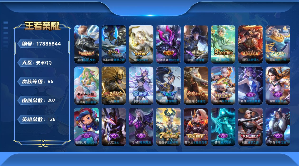 [17886844]【特价急出/详情看图】安卓Q-V6-最强王者段位-126英雄-207皮肤-1典藏皮肤-1星元-4传说-50史诗