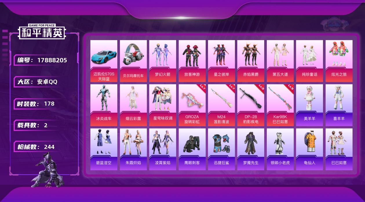 [17888205]安卓 手Q-11粉装-6特效枪-2载具-4粉色飞行器-75457热力值-12王牌印记-178套装-244枪皮 【热门品类】:粉装-梦幻火箭,套装-AG战队服,套装-龟仙人 【粉色套装】:粉装-梦幻火箭,粉装-放客神游,粉装-星之彼岸,粉装-赤焰黑爵,粉装-第五大道,粉装-纯珍童话,粉装-碧蓝澄空,粉装-炫光之旅,角色-冰炎战车,角色-烟云彩露,粉装-星穹咏叹调 【粉色枪皮等级】:GROZA-旋转彩虹(七级),Kar98K-巳巳如意(五级),M24-莲影清波(七级),Mk14-福马献瑞(五级),AA12-G-萌骑幻想(五级),DP-28-豹影疾电(五级) 【粉色载具】:迈凯伦570S(天际蓝),布尔玛摩托车 【粉色枪皮】:GROZA-旋转彩虹,Kar98K-巳巳如意,M24-莲影清波,Mk14-福马献瑞,AA12-G-萌骑幻想,DP-28-豹影疾电 【粉色飞行器】:炫彩糖果飞行器,梦幻火箭飞行器,花傲天飞行器,龙翔九天飞行器 【粉色降落伞】:梦幻火箭降落伞,星之彼岸降落伞,洛神天依降落伞,天之羽翼降落伞,圣光天使降落伞,千面幻镜降落伞,旋转彩虹降落伞,仲夏莫吉托降落伞,飒粉甜心降落伞,炫光之旅降落伞,圣堂之誓降落伞,蜜语绒猫降落伞,镜域双华降落伞,千金淑猫降落伞,雪月幻音降落伞,绯果甜心降落伞,星穹咏叹调降落伞,喜羊羊与灰太狼降落伞,炫彩糖果降落伞 【稀有套装】:套装-龟仙人,套装-巳巳如意,套装-小鸟芋圆,套装-雪国风尚,套装-炫彩糖果,套装-马上有钱,角色-摩登魅猫,套装-燕燕于飞,套装-鱼渊荷华,角色-风玲,套装-粉恋花,套装-紫幽梦,套装-蓝冰羽,套装-星渊小夜曲,套装-朱霞炽焰,套装-凌霄紫焰,玩偶服-美羊羊,玩偶服-喜羊羊 【稀有枪皮】:AUG-冰晶雪宝,AKM-彩虹符号,AKM-影袭,AKM-星之彼岸,AKM-灼热熔岩,AKM-破晓战魂,AKM-虎虎生威,AKM-霓虹街区,AKM-龙的传人,AKM-玄冥寒域,M16A4-蓝色火焰,SCAR-L-夏日绵绵冰,SCAR-L-夜灯,SCAR-L-玉兔迎春,SCAR-L-红色方程式,M416-糯团青竹,M416-紫翼圣骑,M416-红色方程式,GROZA-异彩先驱,GROZA-影袭,GROZA-恐龙拽拽,GROZA-懵萌河马,GROZA-田园牧歌,AUG-天降萌叽,AUG-甜蜜菠萝,AUG-耀粉歌者,QBZ-洛