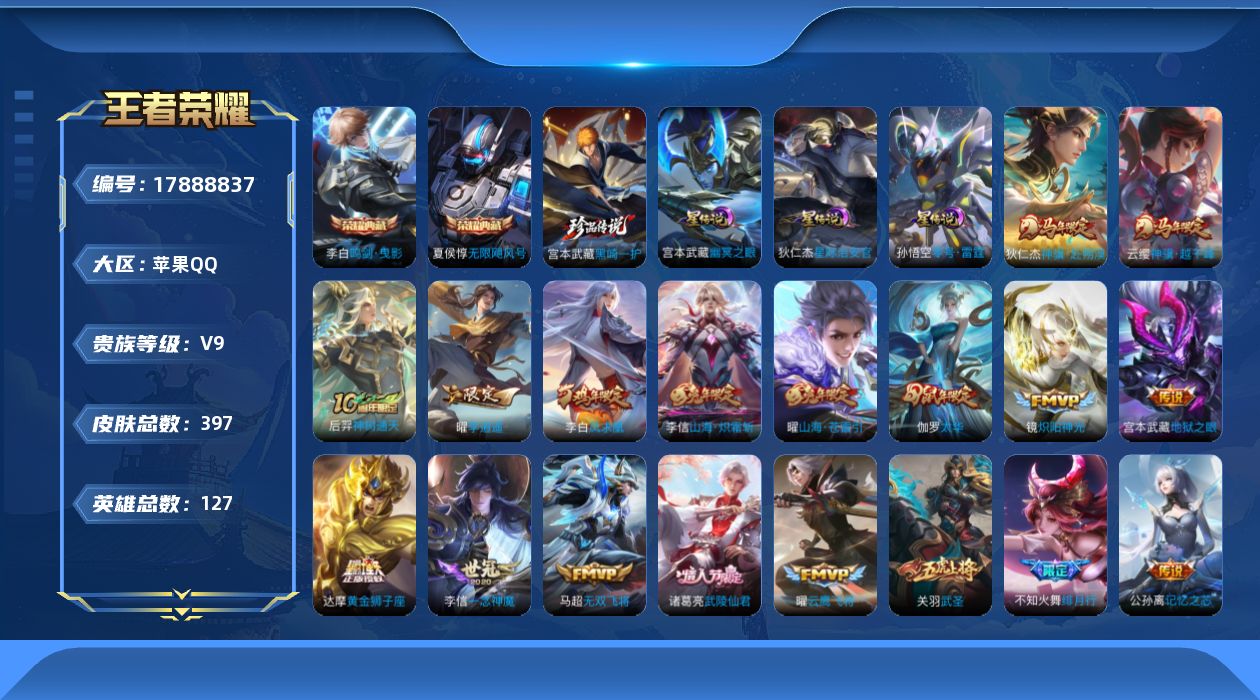 - [11769047]V7 2典藏 9传说 123英雄 202皮肤 可修改实名 优质装备:鸣剑·曳影,银白咏叹调(倪克斯侍卫),云鹰飞将(小将军),炽阳神光,一念神魔,末日机甲-孙策,挚爱之约,无双飞将,诡秘之主,涂山容容 珍宝阁皮:妄想食味,玩趣恶龙 限定皮:愿照·九州拓(澜年限),鸣野蒿,至尊宝,高山流水,圣诞老人,猪悟能,百木心枪 史诗皮:赞萌露比,糖绘人间,化蝶舞,灵蛊蚀心,星界战将,谪仙醉月,龙之律动,藏狐·褐绒,百相守梦-周瑜,茶境仙,撼地雄心,破空之剑,战舞者,百相守梦-黄忠,黄金分割率,千年之狐,永昼,冰冠公主,偶像歌手,暗夜猫娘,猫狗日记-孙策,乱世虎臣,节奏热浪,修罗,功夫厨神,德古拉伯爵,幽灵船长,鬼剑武藏,心灵战警,乘风破浪,水晶猎龙者,曙光守护者,原初追逐者,圣诞狂欢,鹰眼统帅,魅力维加斯,黎明之约,赏金猎手,无心,未来纪元-赵云