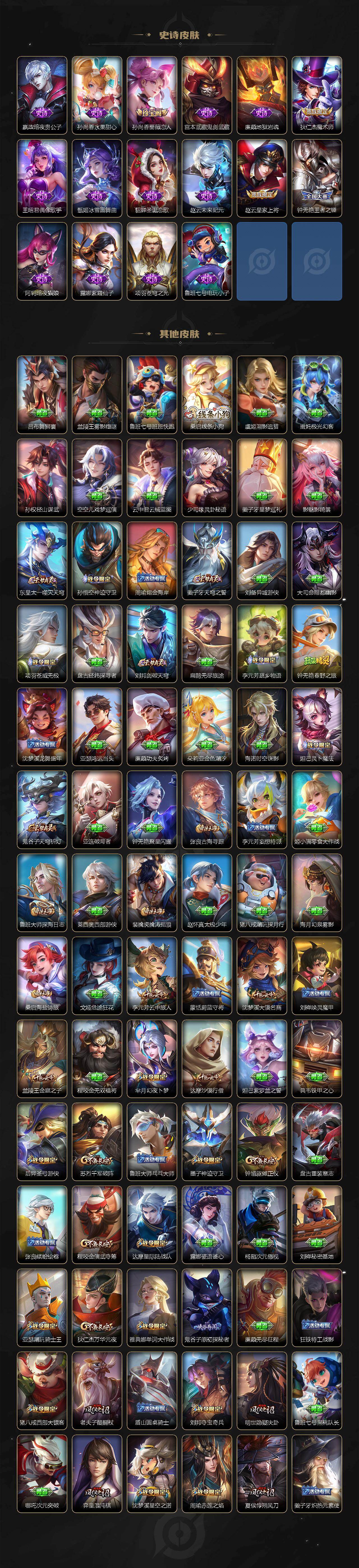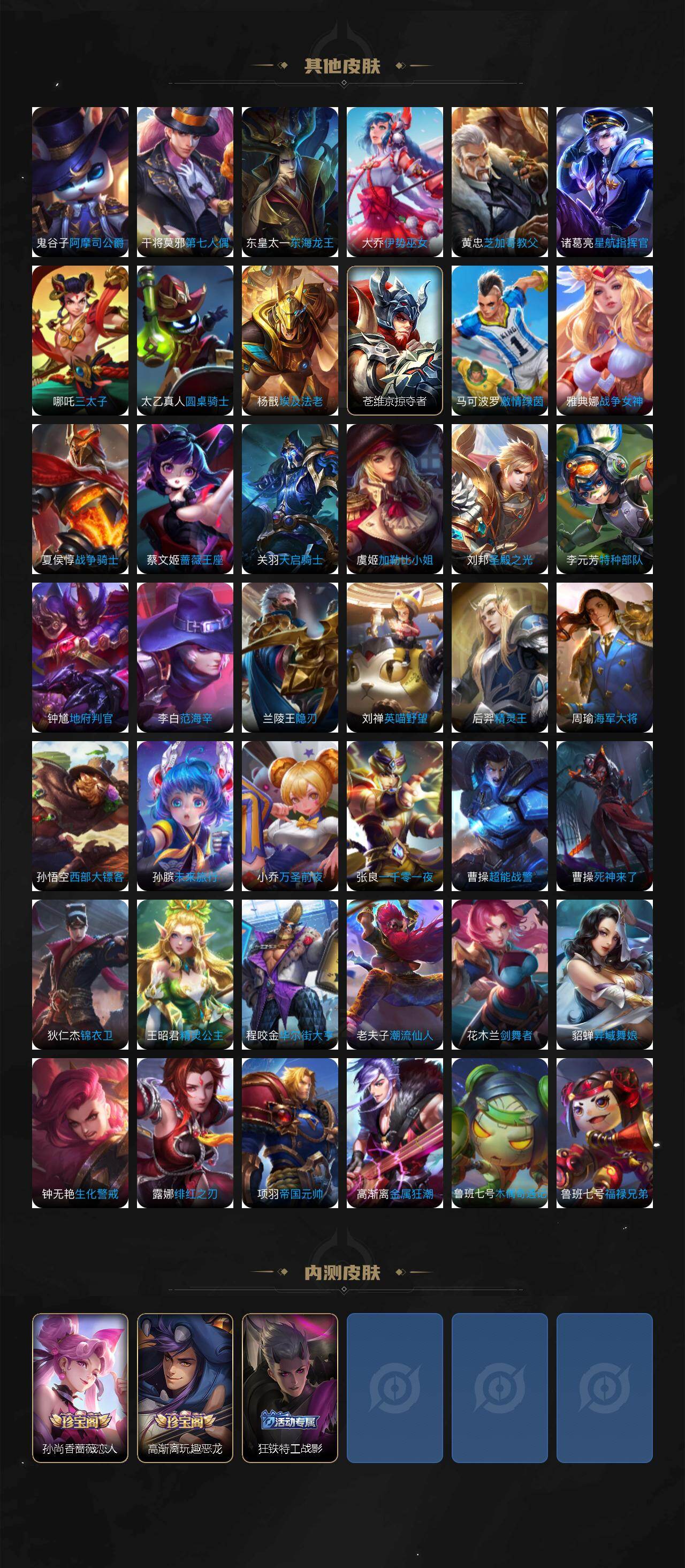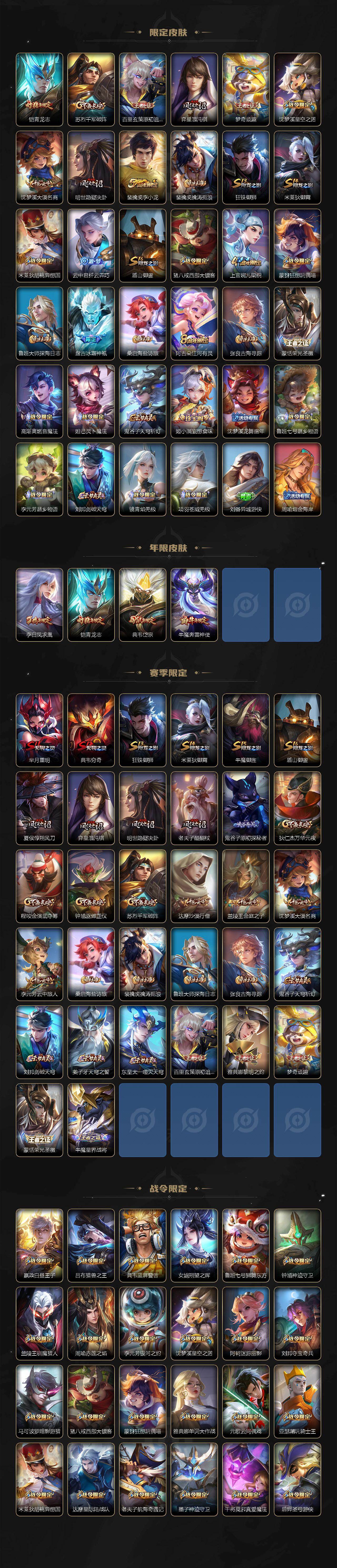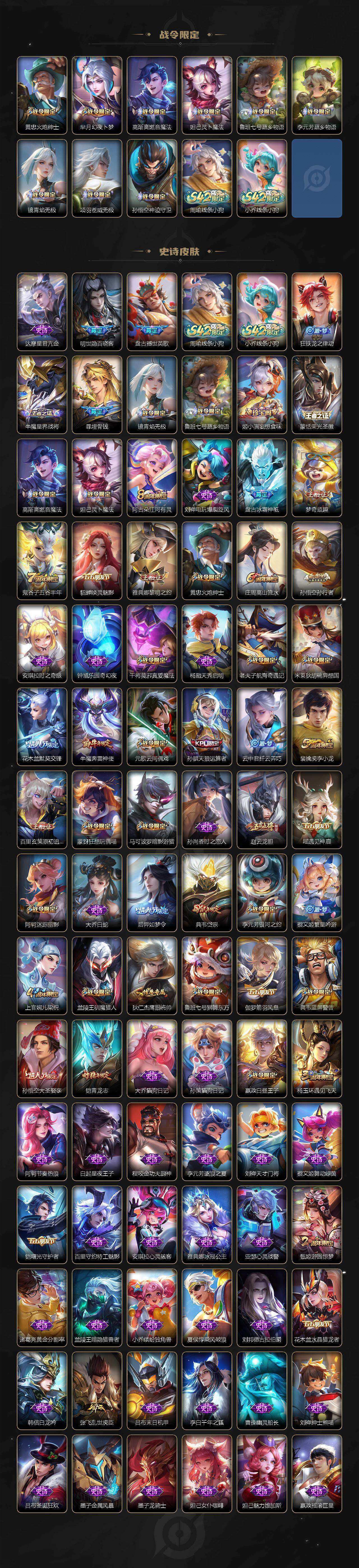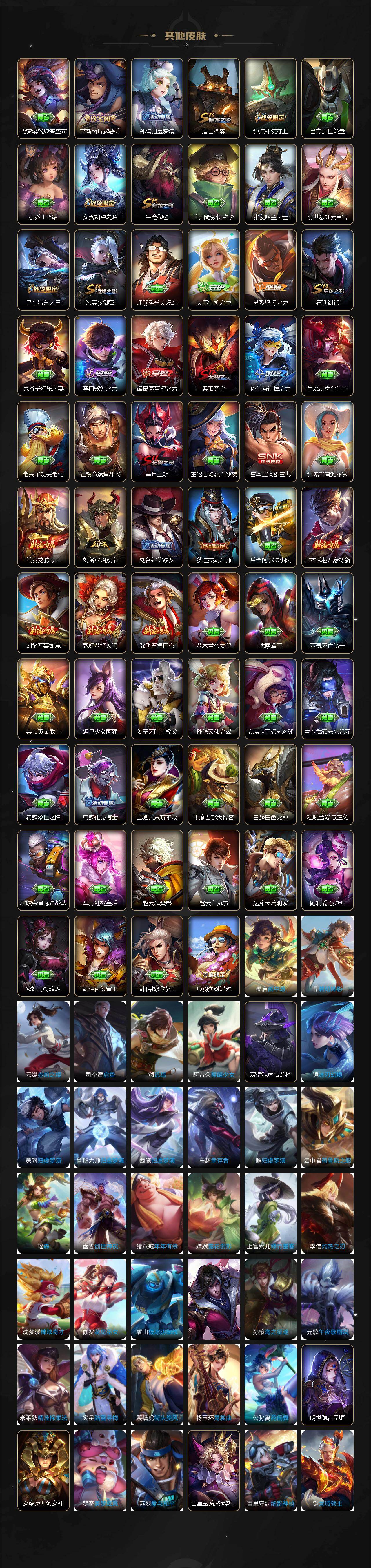 【限定皮肤】:公孙离离恨烟,暃埋骨钱,姜子牙天穹之誓,狄仁杰阴阳师,赵云皇家上将,赵云龙胆,墨子神迹守卫,嬴政白昼王子,孙尚香蔷薇恋人,孙尚香异界灵契,鲁班七号狮舞东方,庄周高山流水,高渐离玩趣恶龙,阿轲迷踪丽影,钟无艳王者之锤,孙膑天狼运算者,芈月重明,芈月幻夜卜梦,吕布猎兽之王,周瑜赤莲之焰,元歌云间偶戏,夏侯惇朔风刀,甄姬游园惊梦,典韦穷奇,典韦蓝屏警告,典韦岱宗,马可波罗暗影游猎,狄仁杰魔术师,狄仁杰万华元夜,达摩星际陆战队,达摩沙漠行僧,项羽海滩派对,老夫子醍醐杖,老夫子航海奇遇记,程咬金演武夺筹,刘邦夺宝奇兵,兰陵王驯魔猎人,兰陵王金庭之子,花木兰默契交锋,亚瑟潮玩骑士王,孙悟空大圣娶亲,孙悟空孙行者,牛魔御旌,牛魔奔雷神使,后羿如梦令,后羿圣弓游侠,李元芳银河之约,李元芳云中旅人,虞姬启明星使,钟馗神迹守卫,钟馗驱傩正仪,杨玉环遇见飞天,女娲朔望之晖,干将莫邪真爱魔法,雅典娜单词大作战,雅典娜黎明之约,蔡文姬繁星吟游,鬼谷子原初探秘者,鬼谷子五谷丰年,黄忠火炮绅士,铠青龙志,苏烈千军破阵,百里玄策原初追逐者,弈星混沌棋,梦奇顽趣,沈梦溪星空之诺,沈梦溪大漠名商,明世隐疑决卦,裴擒虎李小龙,裴擒虎擒涛扼浪,狂铁御狮,米莱狄御霄,米莱狄胡桃异想国,云中君纤云弄巧,盾山御銮,猪八戒西部大镖客,上官婉儿梁祝,蒙犽狂想玩偶喵,鲁班大师探海日志,盘古冰霜神祇,桑启海盐诗旅,阿古朵江河有灵,张良古海寻踪,蒙恬荣光圣徽,高渐离燃音魔法,妲己灵卜魔法,鬼谷子天穹祈灯,姬小满妄想食味,沈梦溪龙舞盛年,鲁班七号蔬乡物语,李元芳蔬乡物语,刘邦剑破天穹,镜青焰无极,项羽苍威无极,刘备异域游侠,周瑜熔金海岸